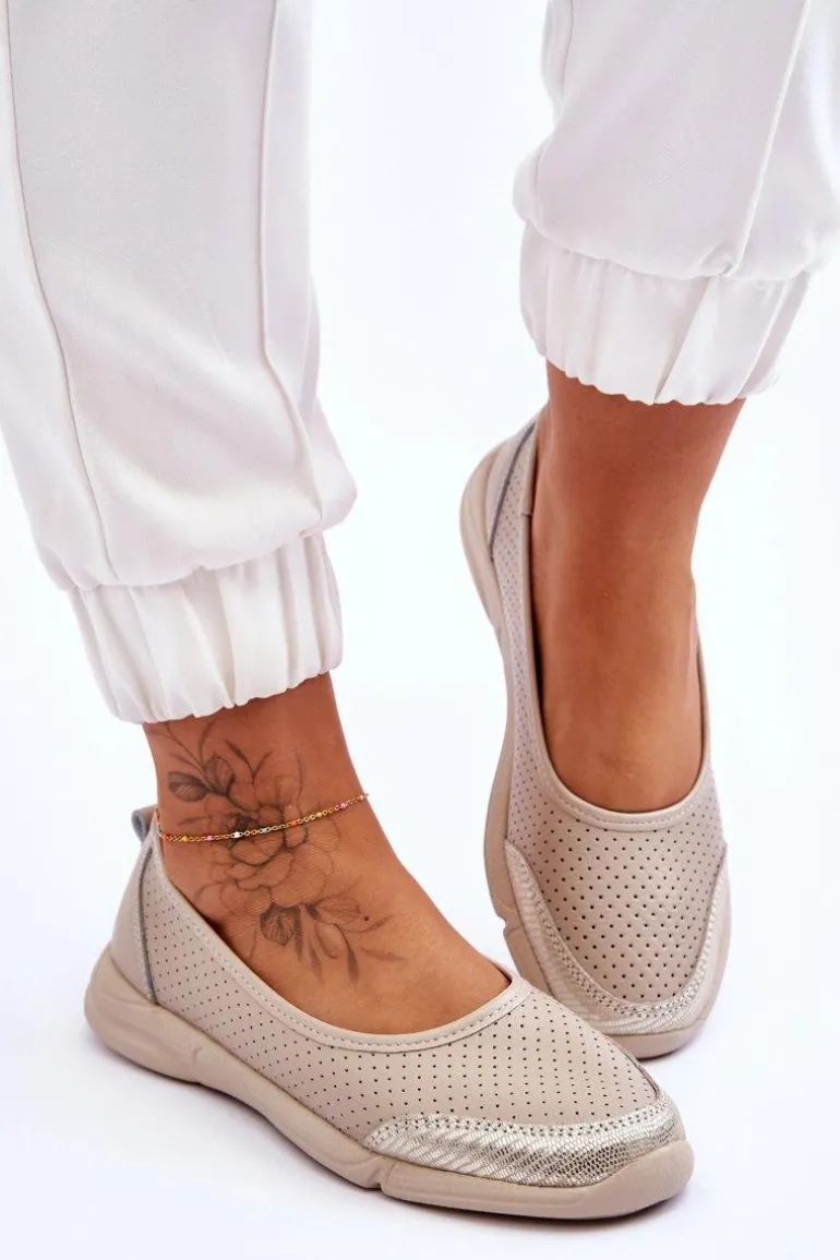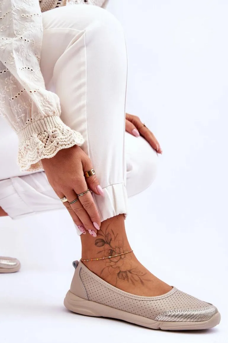 Modne, damskie balerinki idealnie sprawdzą się na wiele okazji. Wykonane z naturalnej skóry w ażurowy wzorek. Posiadają miękką, skórzaną wkładkę, która zapewni komfort podczas użytkowania. Niezwykle lekki model. Taki fason obuwia powinien znaleźć się w każdej garderobie! Niski obcas zapewni stabilność w każdej sytuacji. Przy wyborze rozmiaru prosimy sugerować się tabelą rozmiarów.