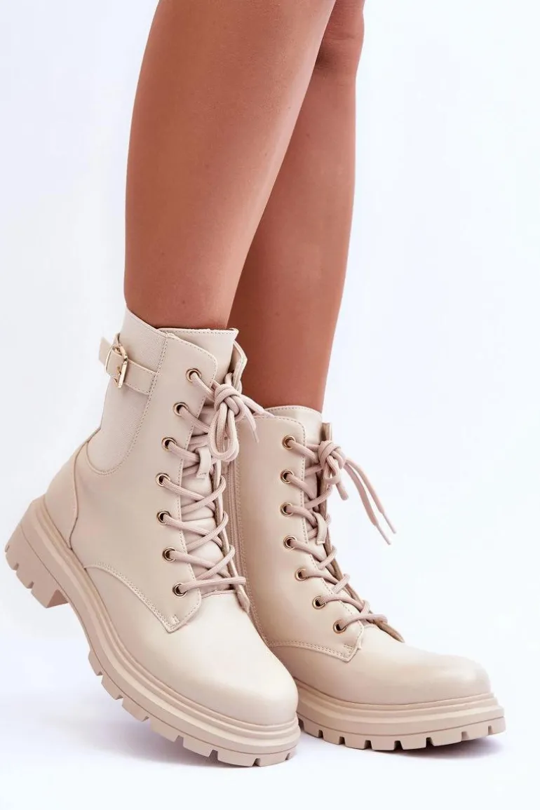 Modne botki wykonane z eko skóry. Osadzone na płaskim obcasie i platformie. Zapinane są z boku cholewki na zamek oraz dodatkowo sznurowane. Model ten posiada ozdobę w postaci paska ze sprzączką. Zapiętek w tym obuwiu jest usztywniany. Świetny model do jesiennych i zimowych stylizacji! Przy wyborze rozmiaru prosimy sugerować się tabelą rozmiarów.