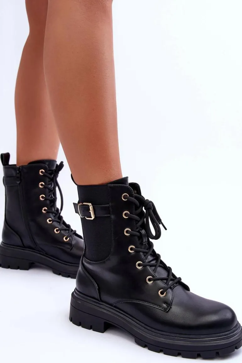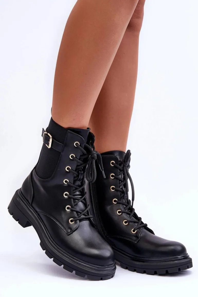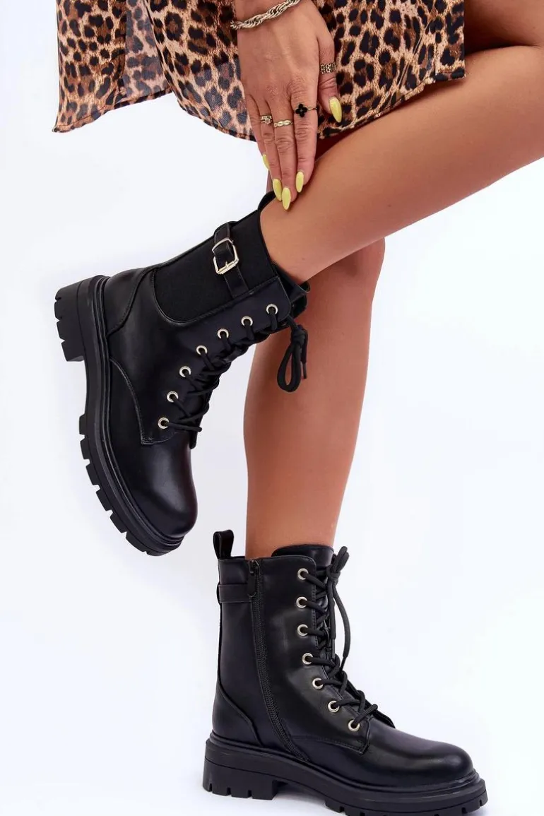 Modne botki wykonane z eko skóry. Osadzone na płaskim obcasie i platformie. Zapinane są z boku cholewki na zamek oraz dodatkowo sznurowane. Model ten posiada ozdobę w postaci paska ze sprzączką. Zapiętek w tym obuwiu jest usztywniany. Świetny model do jesiennych i zimowych stylizacji! Przy wyborze rozmiaru prosimy sugerować się tabelą rozmiarów.