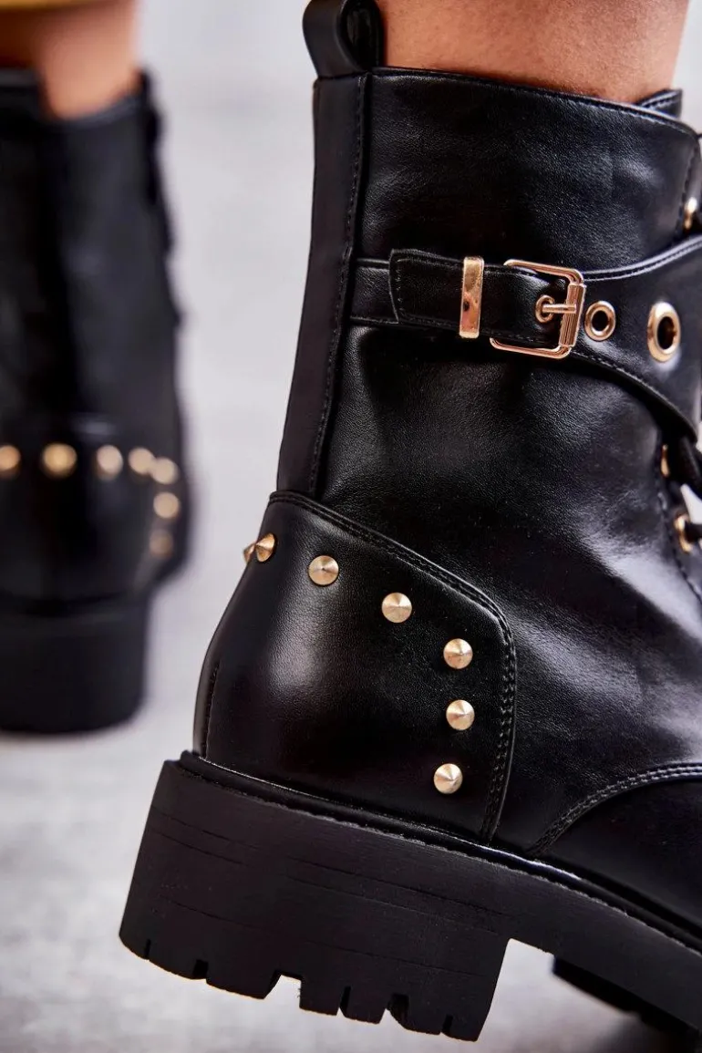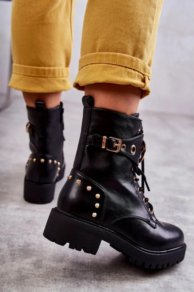 Modne damskie botki świetnie sprawdzą się podczas jesiennych stylizacji! Wykonane z eko skóry. Dodatkowo zostały przyozdobione ćwiekami oraz emblematem z tworzywa sztucznego. Botki posiadają klasyczne wiązanie oraz suwak. W środku znajduje się ocieplenie w postaci koca obuwniczego. Osadzone na płaskim obcasie oraz platformie. Przy wyborze rozmiaru prosimy sugerować się tabelą rozmiarów.