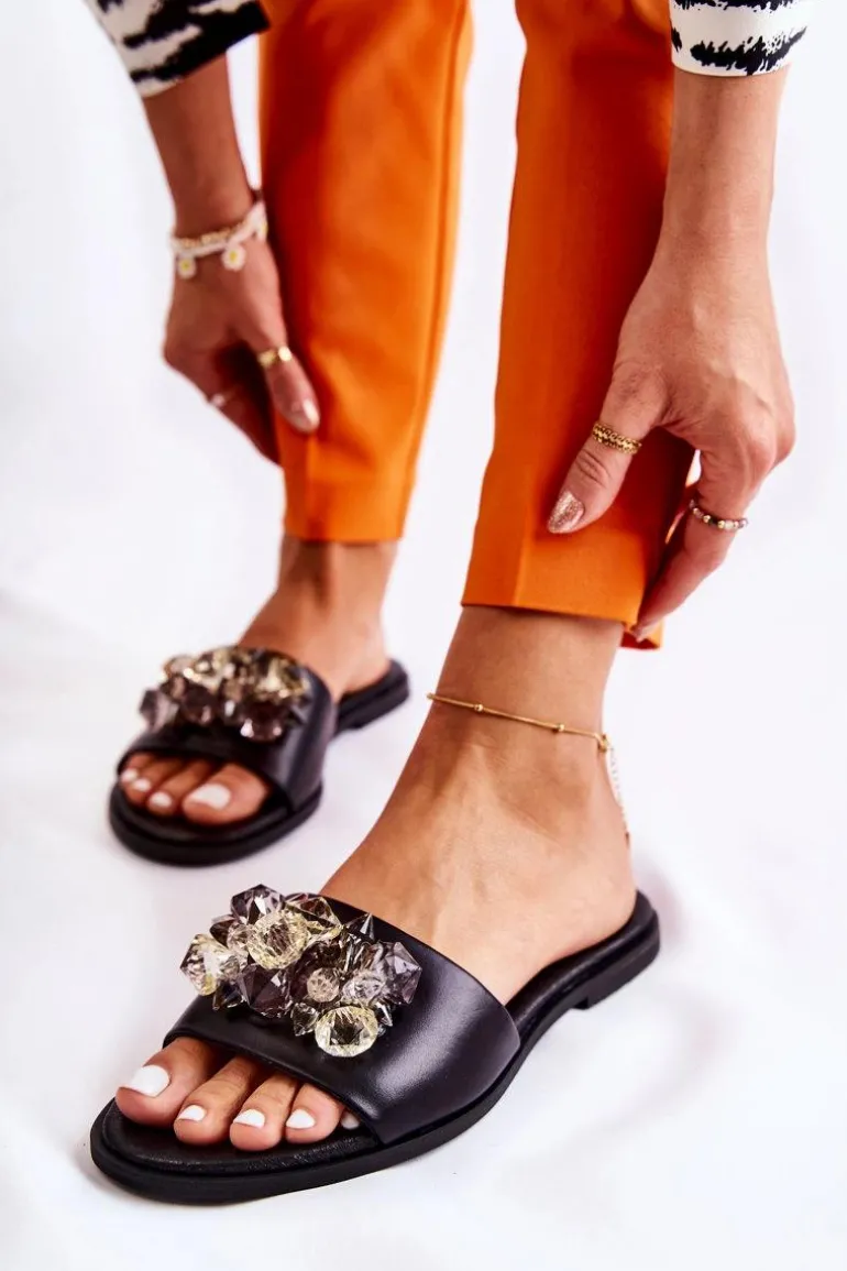 Klasyczne, wsuwane klapki marki Nicole. Buty wykonane są w całości ze skóry naturalnej z dbałością o szczegóły. Posiadają ozdobę na przodzie w postaci kolorowych kryształków. Miękka wkładka także została wykonana z naturalnej skóry, dzięki której komfort użytkowania jest jeszcze większy. Buty osadzone na płaskim obcasie. Koniecznie sprawdź całą naszą kolekcję butów marki Nicole. Przy wyborze rozmiaru prosimy sugerować się tabelą rozmiarów.