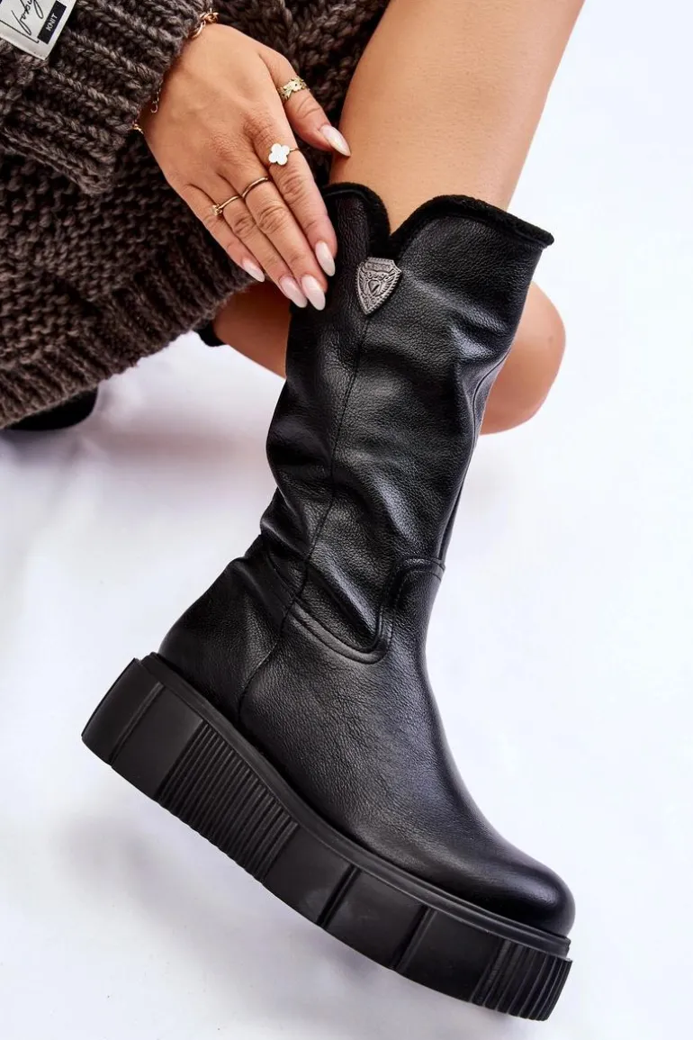 Damskie kozaki zostały wykonane z naturalnej skóry. Model ten posiada suwak z boku cholewki. Wnętrze zostało ocieplone naturalną wełną. Zapiętek jest usztywniany. Kozaki osadzono na masywnej platformie oraz koturnie. Posiadają ozdobny element z boku cholewki. Ten model świetnie sprawdzi się podczas chłodnych, zimowych dni. Przy wyborze rozmiaru prosimy sugerować się tabelą rozmiarów.