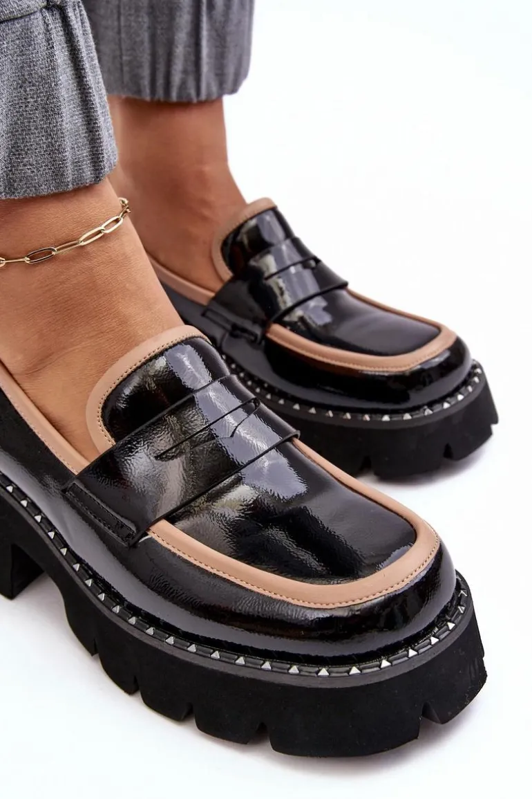 Damskie mokasyny zostały wykonane z eko skóry. Na przodzie posiadają ozdobny paseczek z wycięciem. Model ten został osadzony na płaskim obcasie i platformie, która dodatkowo została ozdobiona ćwiekami. Mokasyny posiadają wkładkę z naturalnej skóry. Ten model jest świetny na sezon wiosenno-jesienny! Przy wyborze rozmiaru prosimy sugerować się tabelą rozmiarów.
