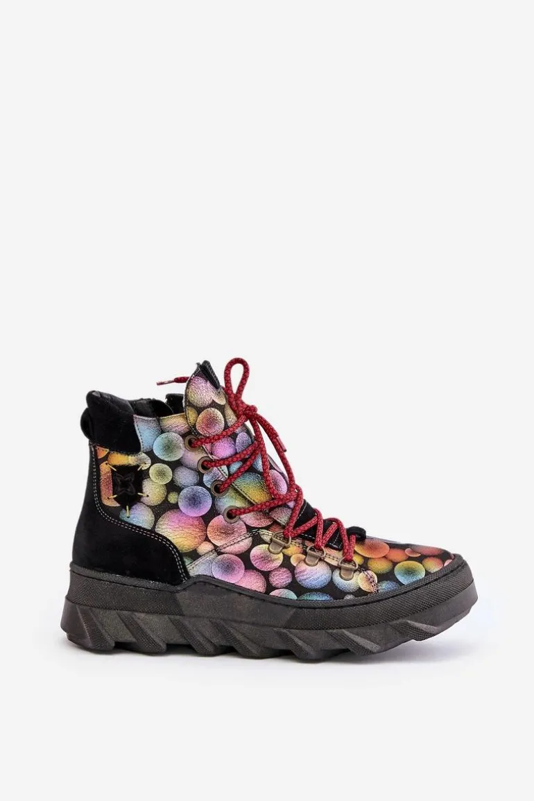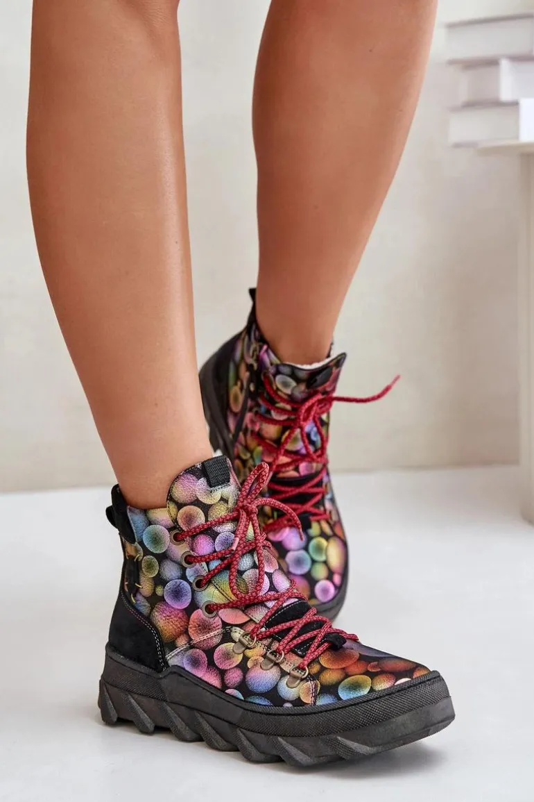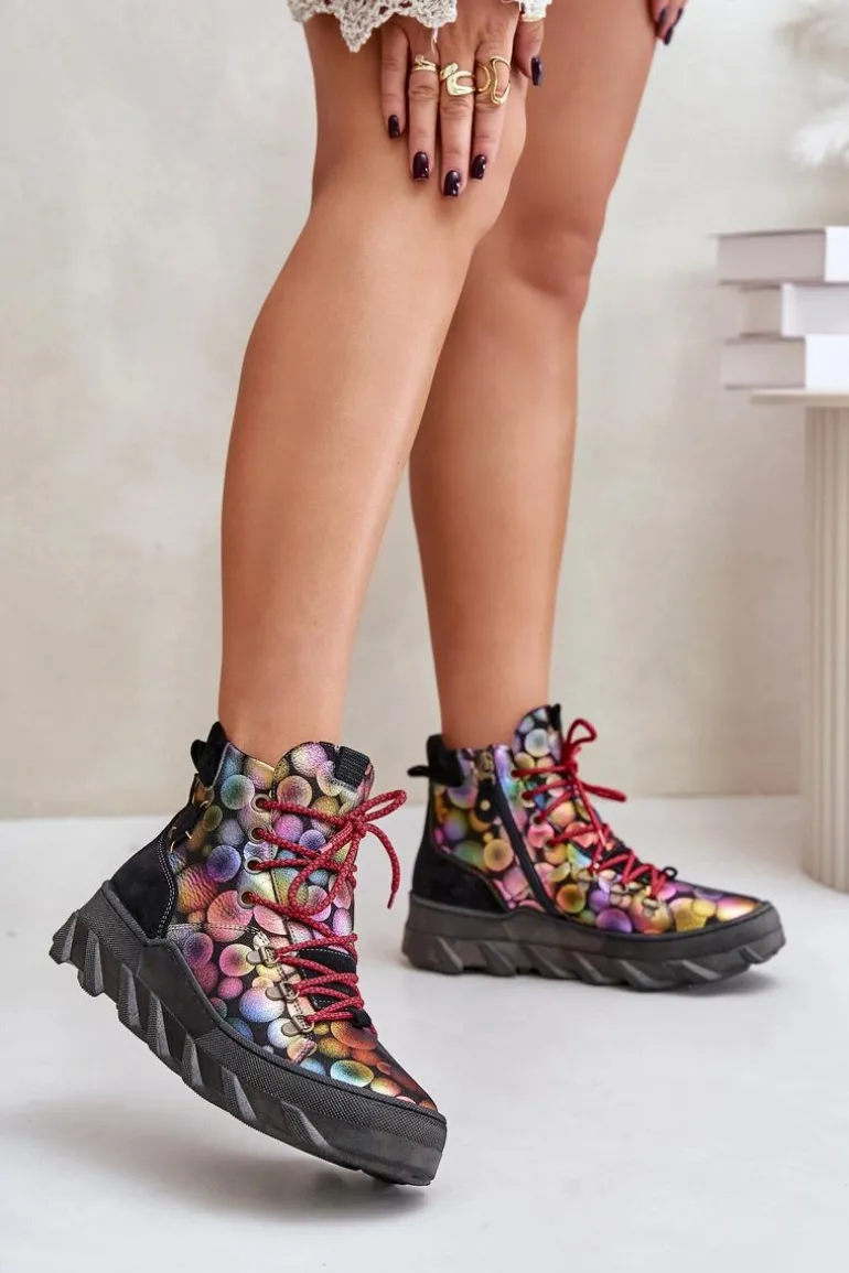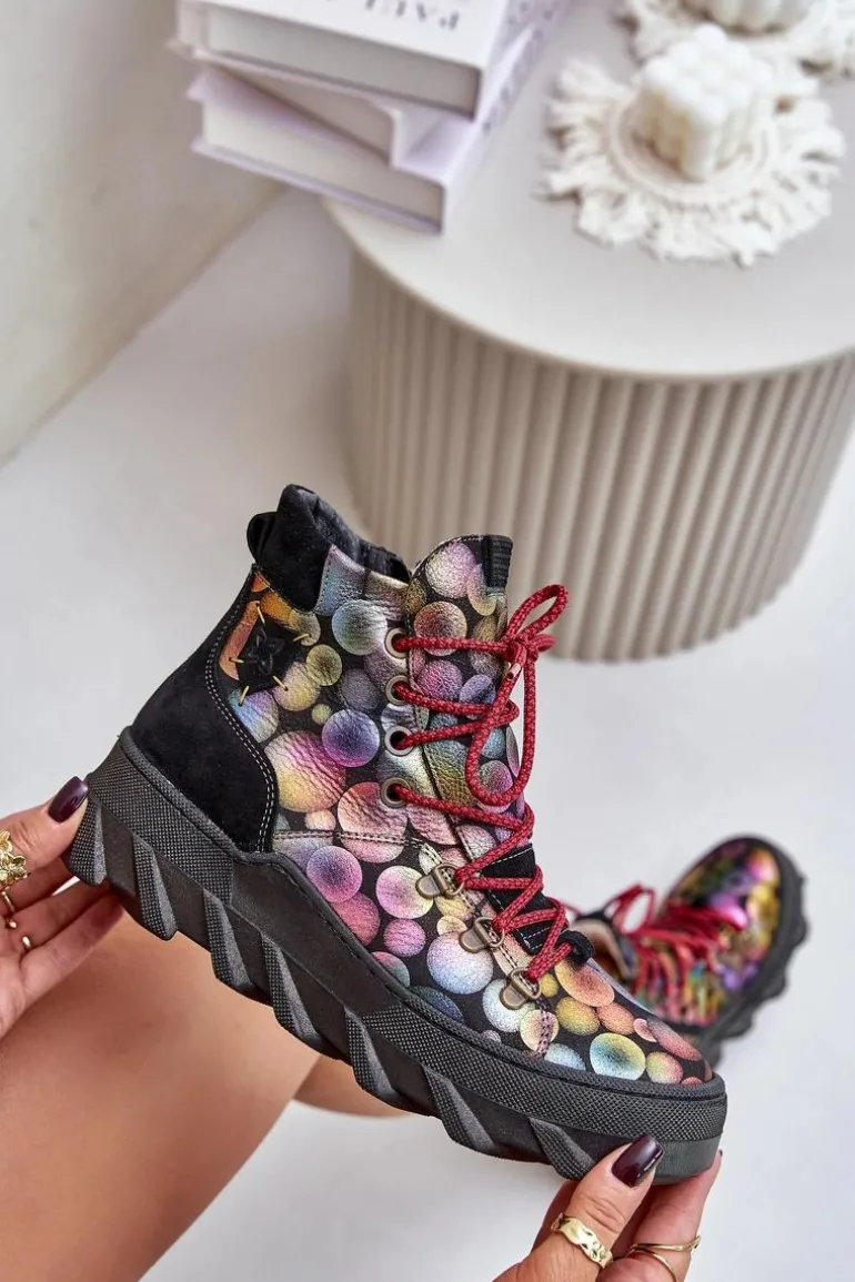 Botki damskie marki Maciejka wykonane są z najwyższej jakości skóry naturalnej. Osadzone na platformie. Z przodu sznurowanie. Model ten zapinany jest na suwak z boku cholewki. Wewnątrz ocieplone kożuchem. Noski zaokrąglone. Usztywniony zapiętek. Przy wyborze rozmiaru prosimy sugerować się tabelą rozmiarów.