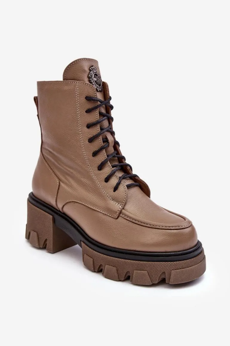 Modne, damskie botki zostały wykonane z wysokiej jakości naturalnych skór. Posiadają klasyczne sznurowanie oraz suwak z boku cholewki. Zapiętek jest usztywniany. Botki osadzono na platformie i masywnym, płaskim obcasie. Podeszwa jest antypoślizgowa. Botki wewnątrz zostały ocieplone kocem obuwniczym. Wkładka jest miękka i wygodna podczas użytkowania. Przy wyborze rozmiaru prosimy sugerować się tabelą rozmiarów.