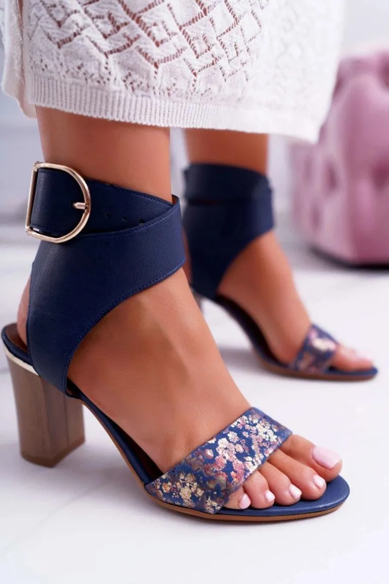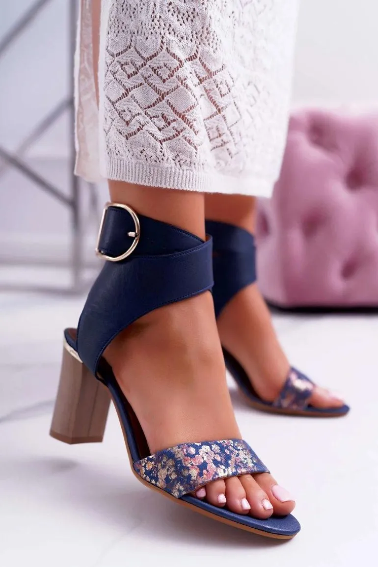 Skórzane Damskie Sandały Maciejka Na Słupku Granatowe 03597