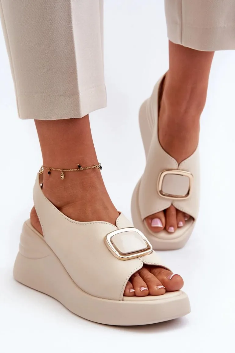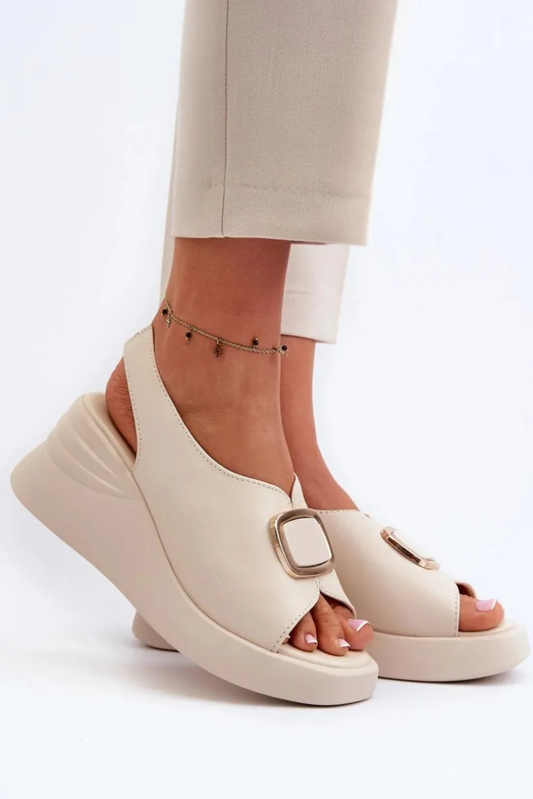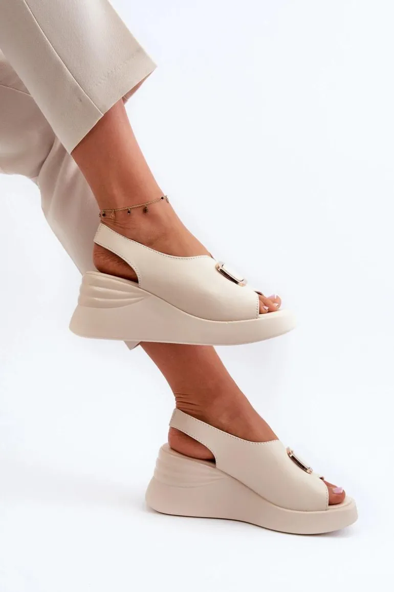Skórzane Damskie Sandały Na Koturnie Z Ozdobą Beżowe Salvania