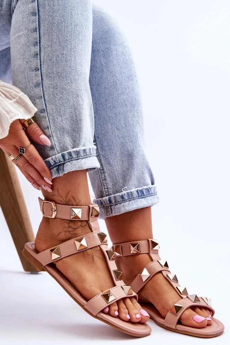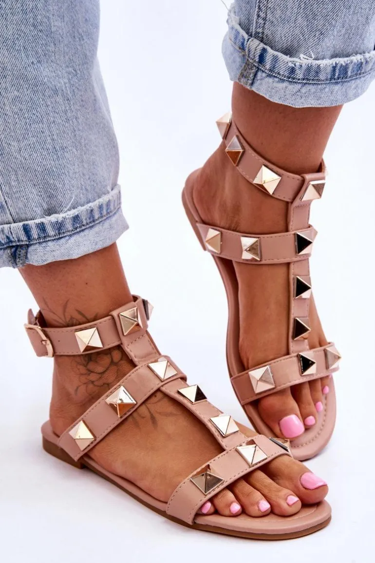 Damskie sandały zostały wykonane z eko skóry. Posiadają zapinanie w postaci regulowanego paska z klamrą. Dodatkowo zostały ozdobione dużymi ćwiekami. Sandały posiadają odkryte palce oraz piętę, co sprawia, że są niezwykle przewiewne. Osadzone na płaskim obcasie. Przy wyborze rozmiaru prosimy sugerować się tabelą rozmiarów.