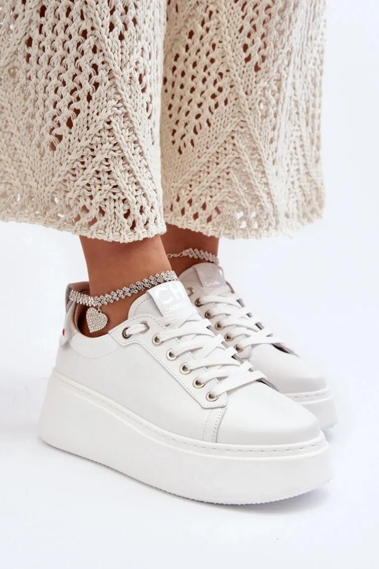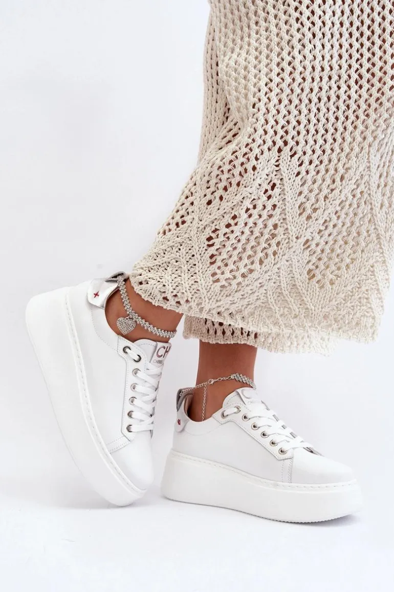 Sneakersy damskie od marki CheBello. Wykonane z wysokiej jakości naturalnej skóry. Osadzone na platformie. Noski zaokrąglone. Model ten dodatkowo posiada bransoletę z cyrkoniami oraz sercem. Fason ten dopasujesz do niemalże każdej stylizacji! Przy wyborze rozmiaru prosimy sugerować się tabelą rozmiarów.