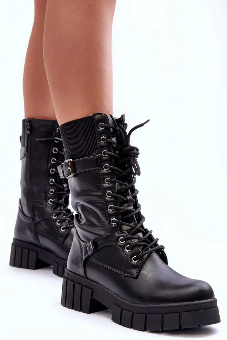 Buty wykonane ze skóry ekologicznej. Osadzone na masywnym obcasie i platformie. Zapinane na suwak z boku oraz dodatkowo sznurowane. Model ten posiada elastyczną wstawkę oraz paseczek z klamrą. Sprawdź całą naszą kolekcję wysokich botków! Przy wyborze rozmiaru prosimy sugerować się tabelą rozmiarów.