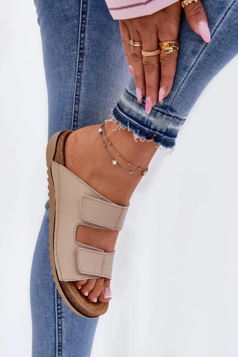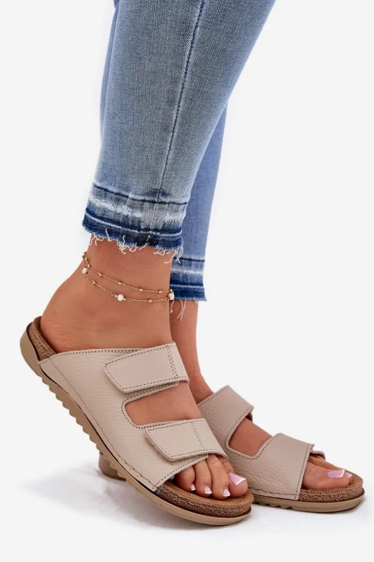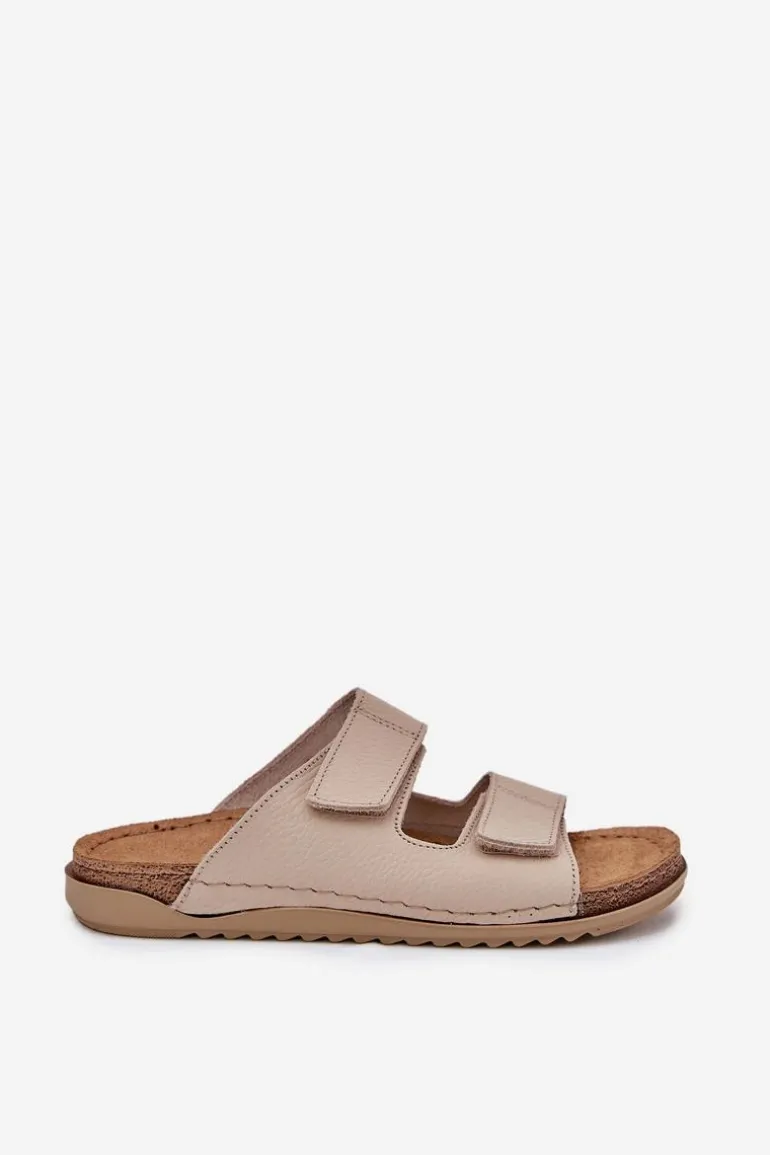 Klapki damskie od marki INBLU. Wykonane z naturalnej skóry. Model ten posiada paski z rzepami, co pozwala na doskonałe dopasowanie do tęgości stopy. Wnętrze wyłożone materiałem skóropodobnym dobrze przepuszczającym powietrze. Wkładka wewnętrzna „COMFORT ANATOMICO” profilowana, dostosowana do kształtu anatomicznego stopy, wykonana z miękkiej, naturalnej skóry. Spód wykonany z lekkiego i elastycznego tworzywa – poliuretanu – zapewnia sprężystość i bardzo dobre przenoszenie obciążeń na podłoże. Użyte materiały i zastosowana technologia zapewnia wysoki komfort użytkowania i wygodę. Przy wyborze rozmiaru prosimy sugerować się tabelą rozmiarów.