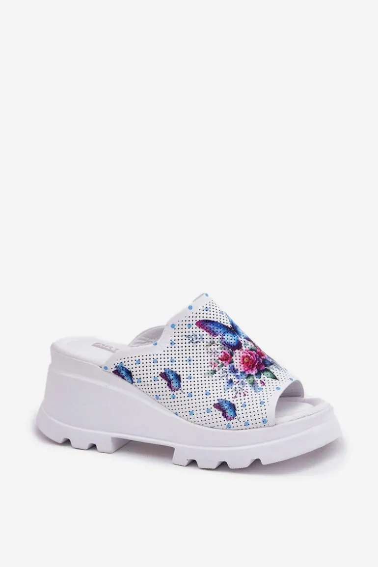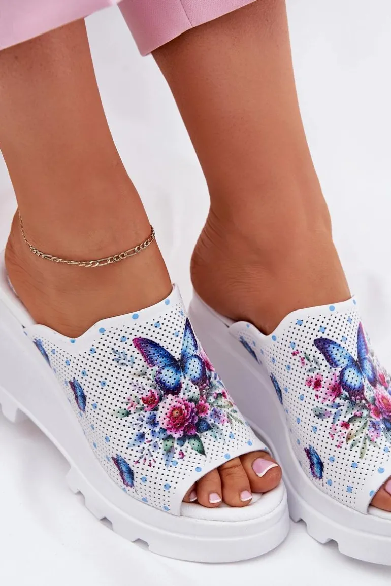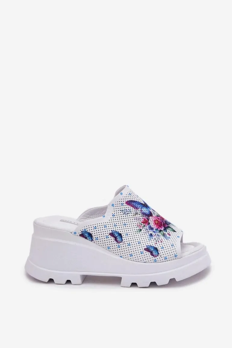 Eleganckie klapki damskie z naturalnej skóry to doskonały wybór na ciepłe dni. Osadzone na koturnie, zapewniają wygodę i stabilność. Model wyróżnia się geometryczną aplikacją, która nadaje nowoczesnego charakteru. Miękka wkładka gwarantuje komfort przez cały dzień, czyniąc te klapki idealnym dodatkiem do letnich stylizacji, łącząc elegancję z funkcjonalnością. Przy wyborze rozmiaru prosimy sugerować się tabelą rozmiarów.