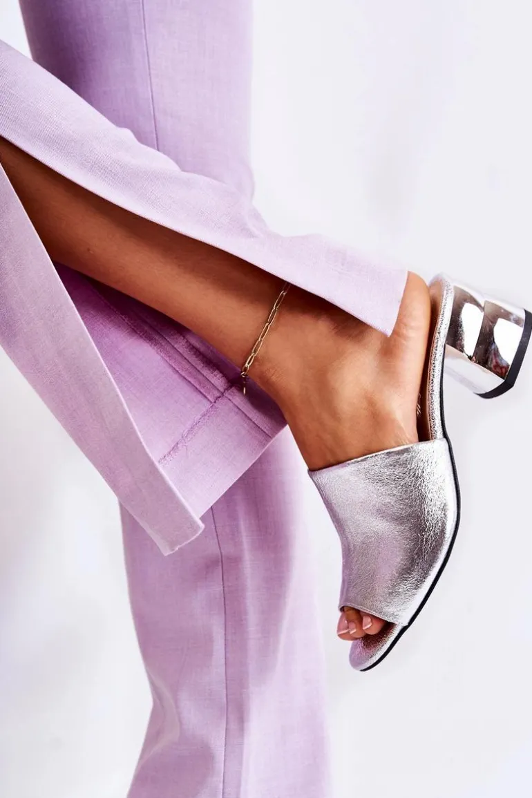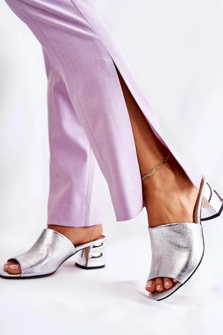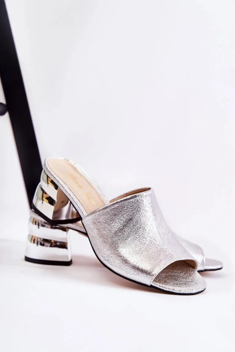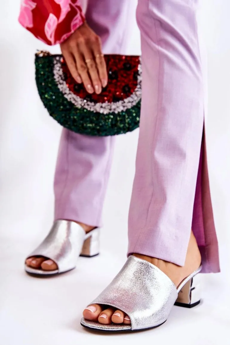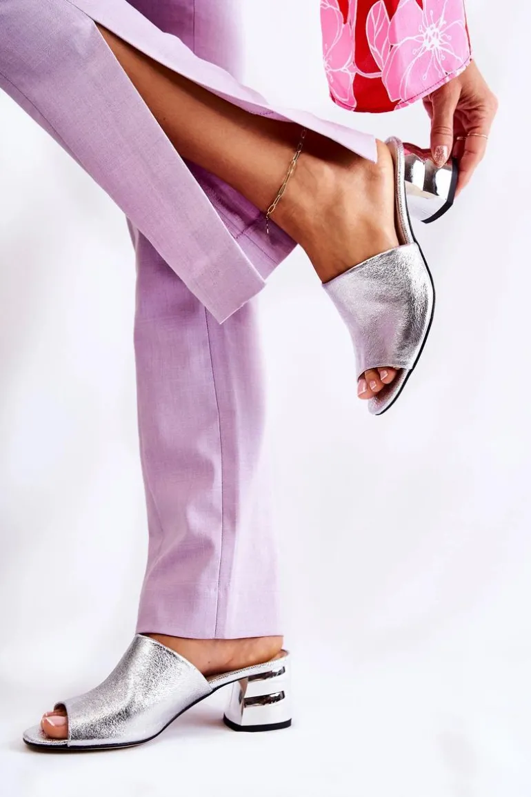 Skórzane Klapki Damskie Na Obcasie Srebrne Perry