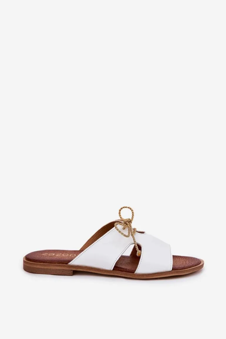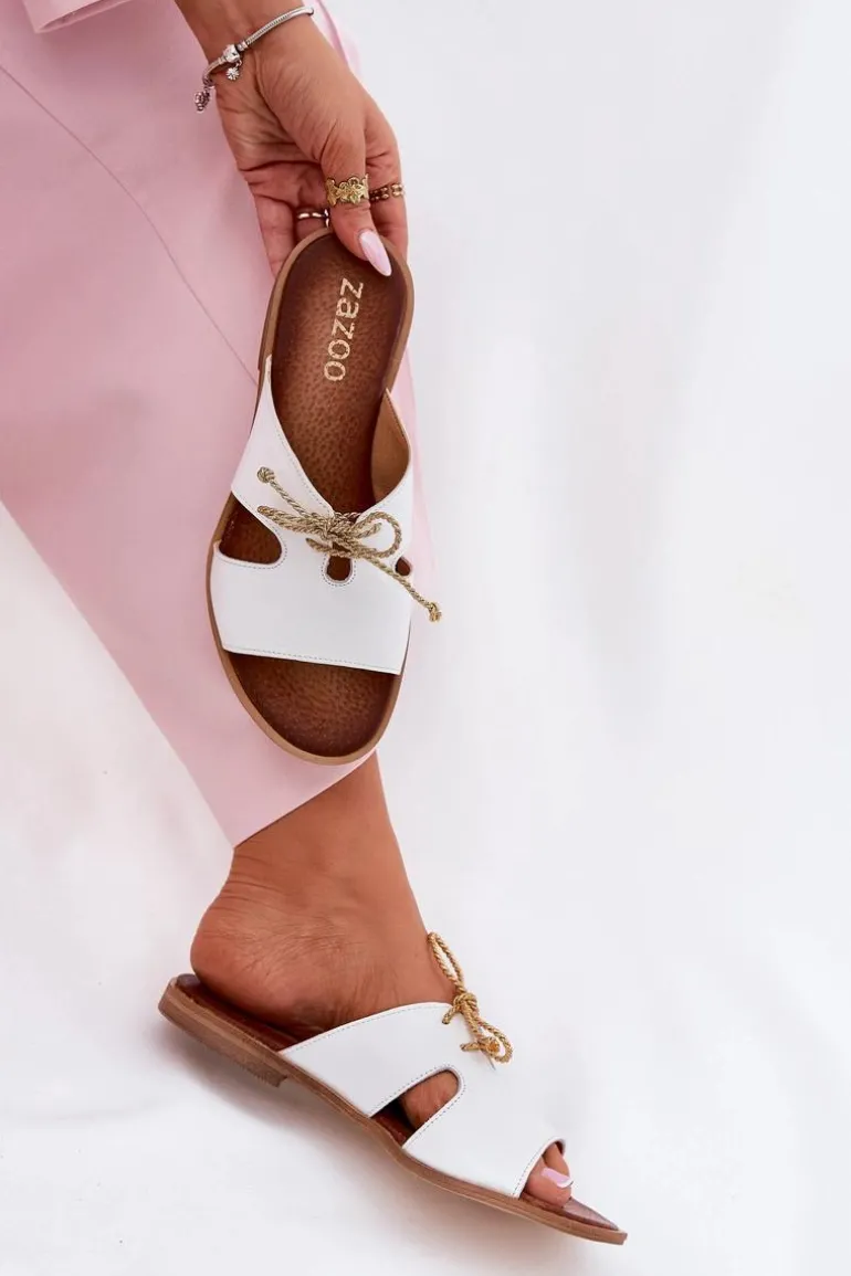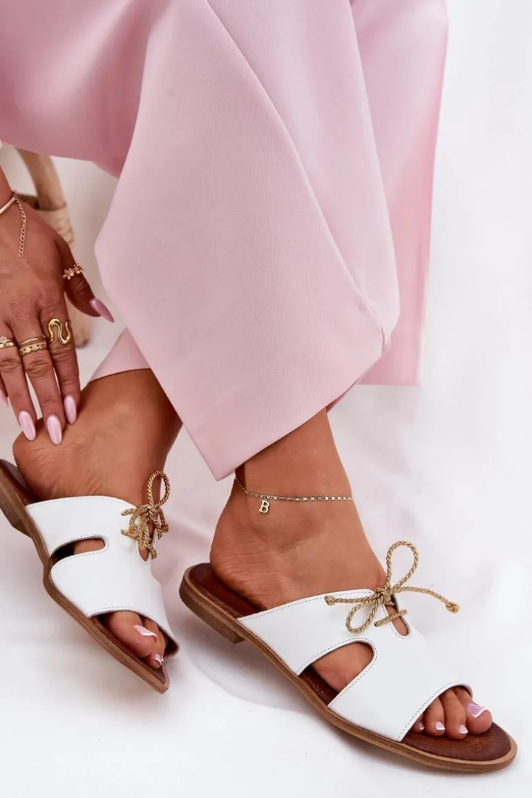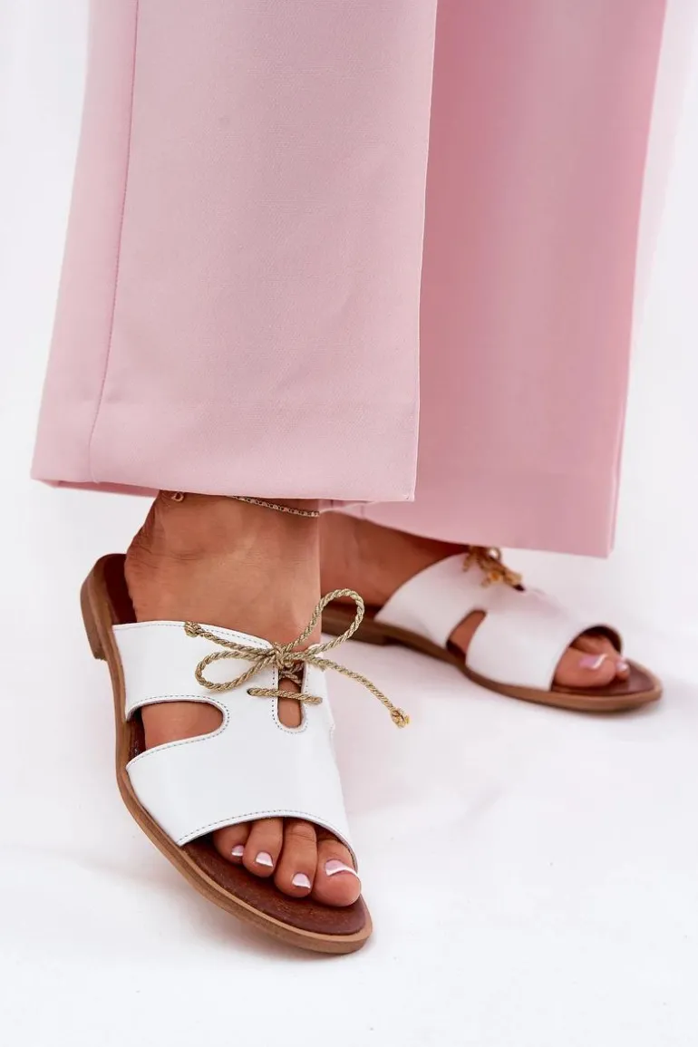 Damskie klapki z naturalnej skóry to świetny wybór na słoneczne dni, łączący elegancję z wygodą. Płaski obcas zapewnia komfort, a szykowny złoty sznureczek na cholewce dodaje im wyjątkowego uroku. Doskonałe do różnych letnich stylizacji, te klapki będą doskonałym dopełnieniem Twojego looku! Przy wyborze rozmiaru prosimy sugerować się tabelą rozmiarów.