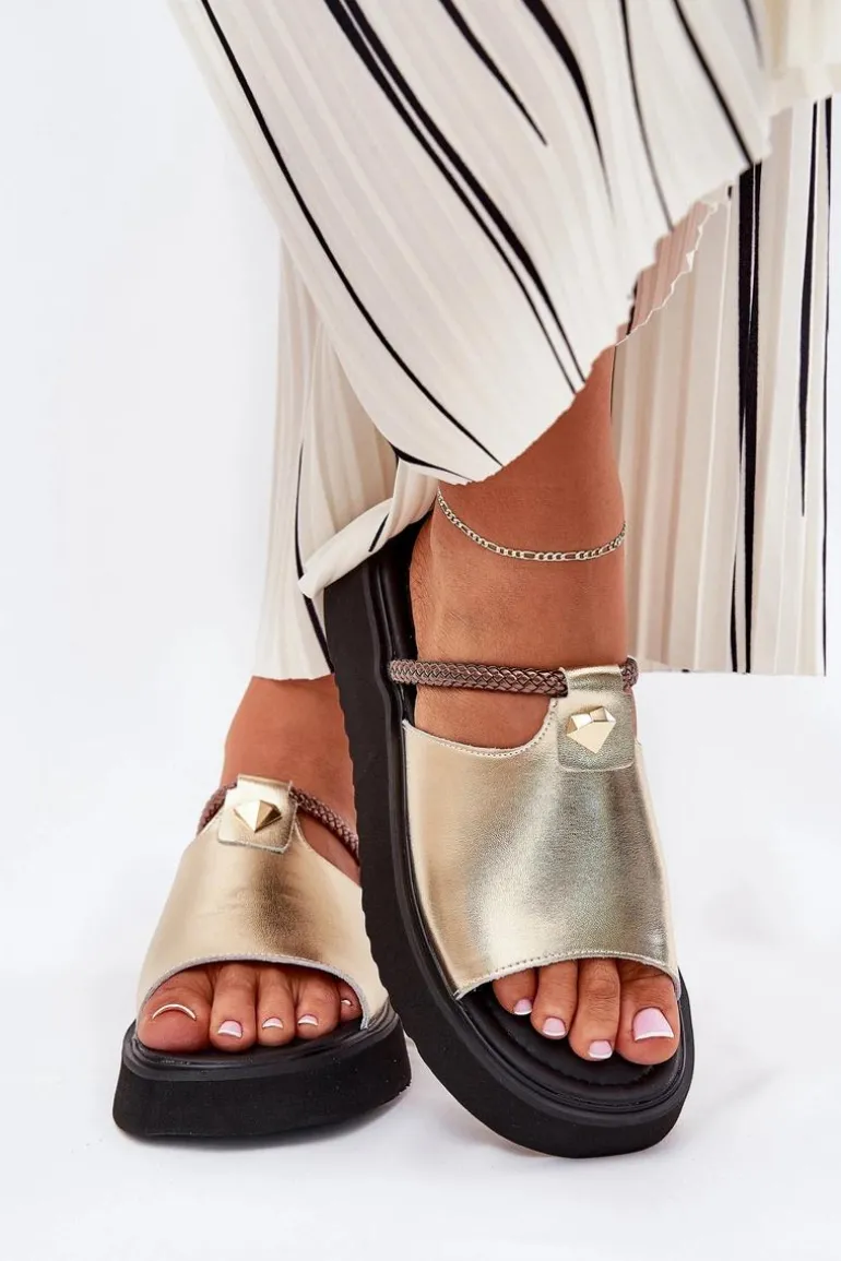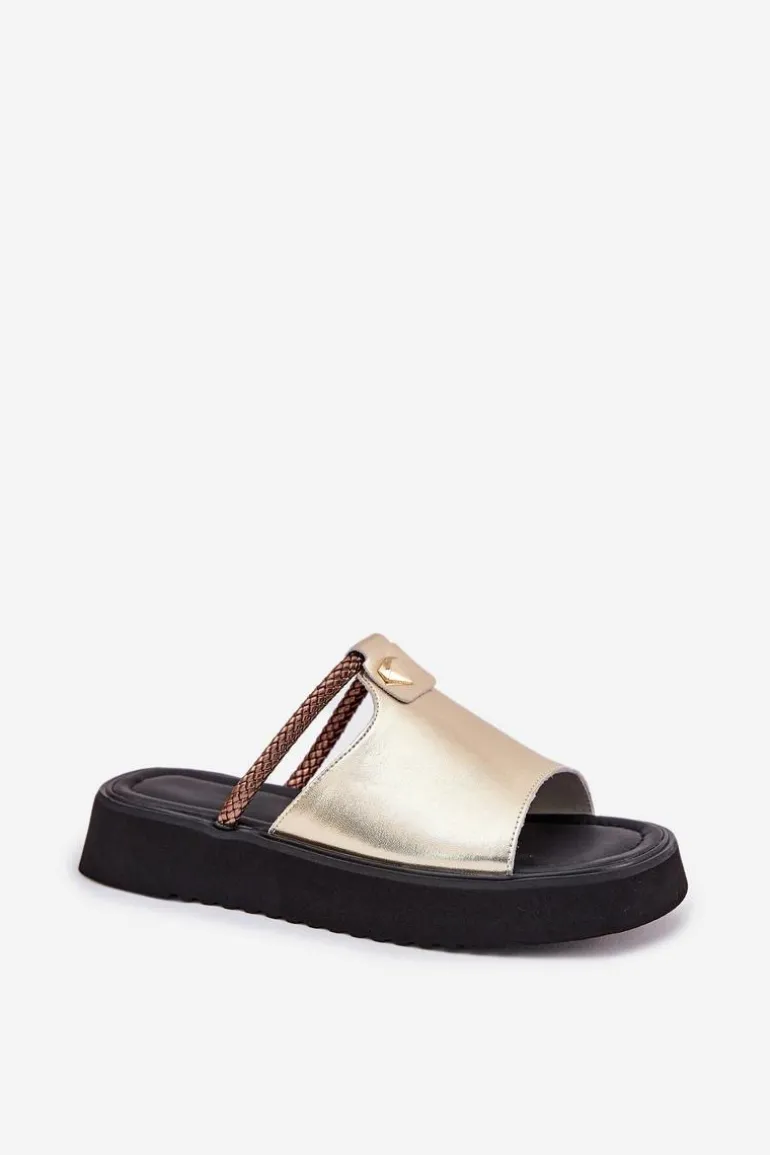 Skórzane Klapki Damskie Na Platformie Z Ozdobnym Paskiem D&A MK51-475 Złote