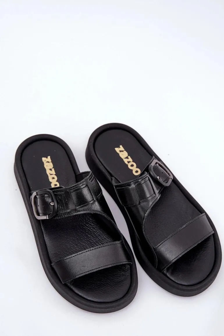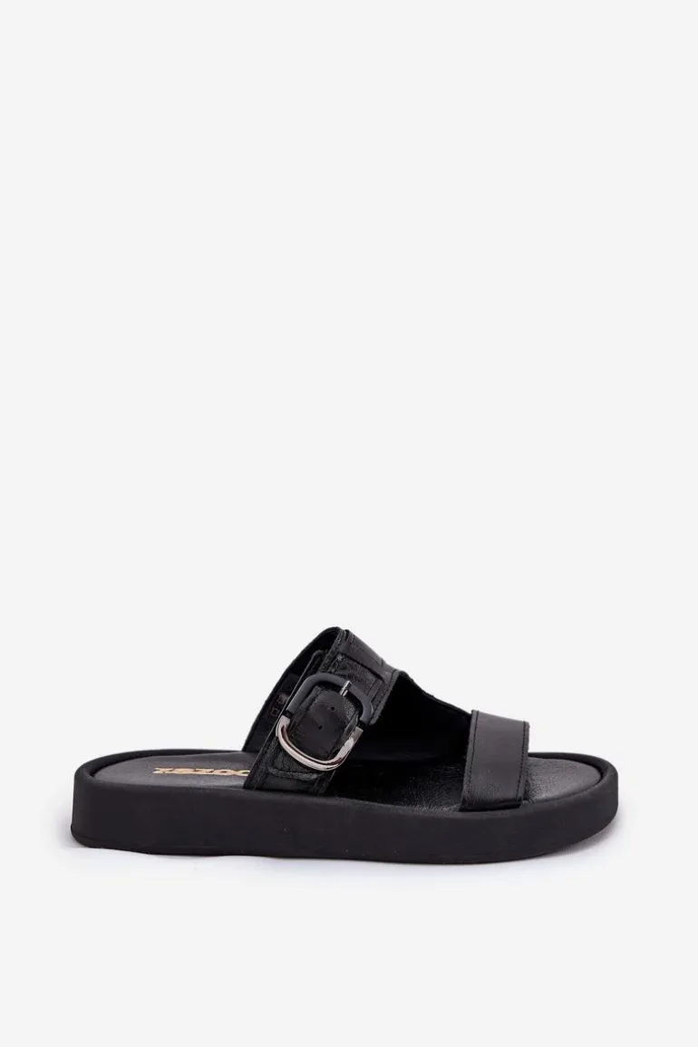 Damskie klapki wykonane z naturalnej skóry. Osadzone na platformie. Doskonałe na letnie dni, te klapki znakomicie uzupełnią każdą stylizację, łącząc modny wygląd z praktycznością. Pasek z klamrą zapewnia dodatkową regulację, a miękka wkładka skórzana gwarantuje komfort noszenia. Przy wyborze rozmiaru prosimy sugerować się tabelą rozmiarów.