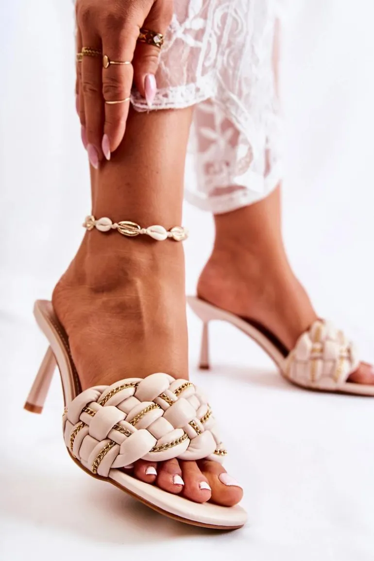 Cudowne klapki wykonane z wysokiej jakości eko skóry. Posiadają pleciony przód z ozdobnym, delikatnym łańcuszkiem. Osadzone na obcasie w postaci szpilki, dzięki któremu nogi będą wyglądać na bardziej smukłe. Wkładka wykonana z eko skóry jest bardzo miękka i komfortowa w użytkowaniu. Nosek odkryty, kwadratowy. Model, który skradnie serca niejednej miłośniczki wysokich obcasów! Koniecznie powinnaś je mieć! Ten fason będzie pasować do wielu stylizacji. Przy wyborze rozmiaru prosimy sugerować się tabelą rozmiarów.
