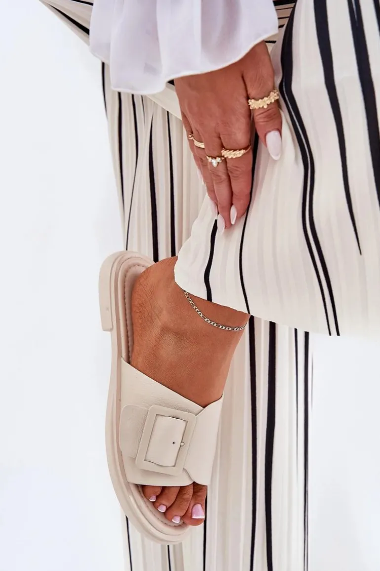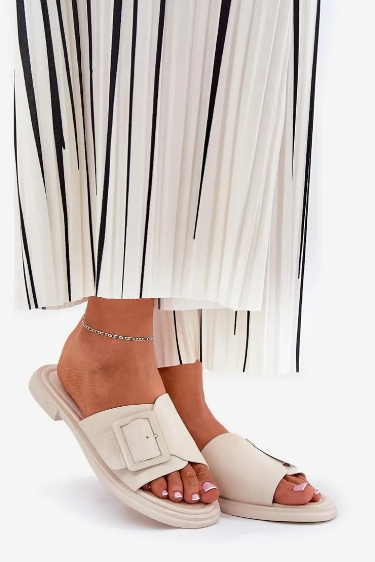 Eleganckie klapki damskie z naturalnej skóry, osadzone na płaskim obcasie, które łączą komfort z prostym stylem. Z przodu duża klamra, która dodaje im wyjątkowego charakteru. Skórzana wkładka zapewnia wygodę przez cały dzień, dbając o odpowiednią amortyzację. Doskonałe na letnie dni, te klapki będą idealnym wyborem do codziennych stylizacji, wprowadzając do nich lekkość i elegancję. Przy wyborze rozmiaru prosimy sugerować się tabelą rozmiarów.