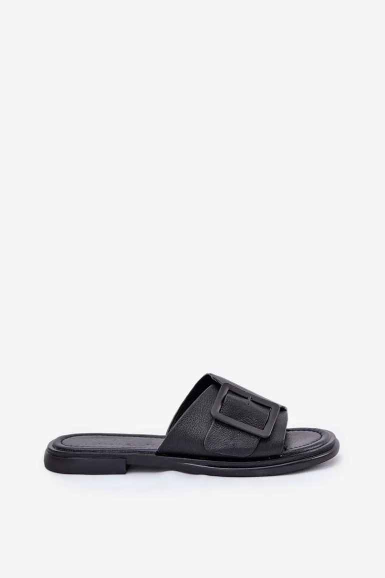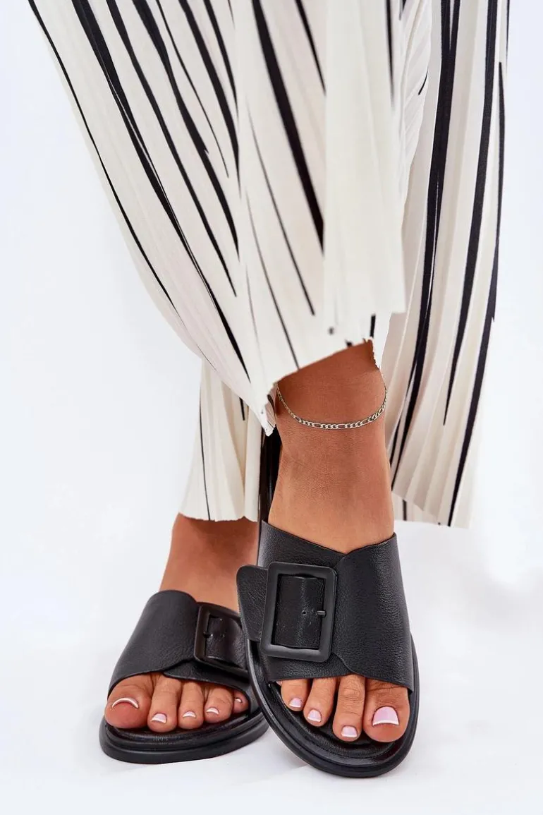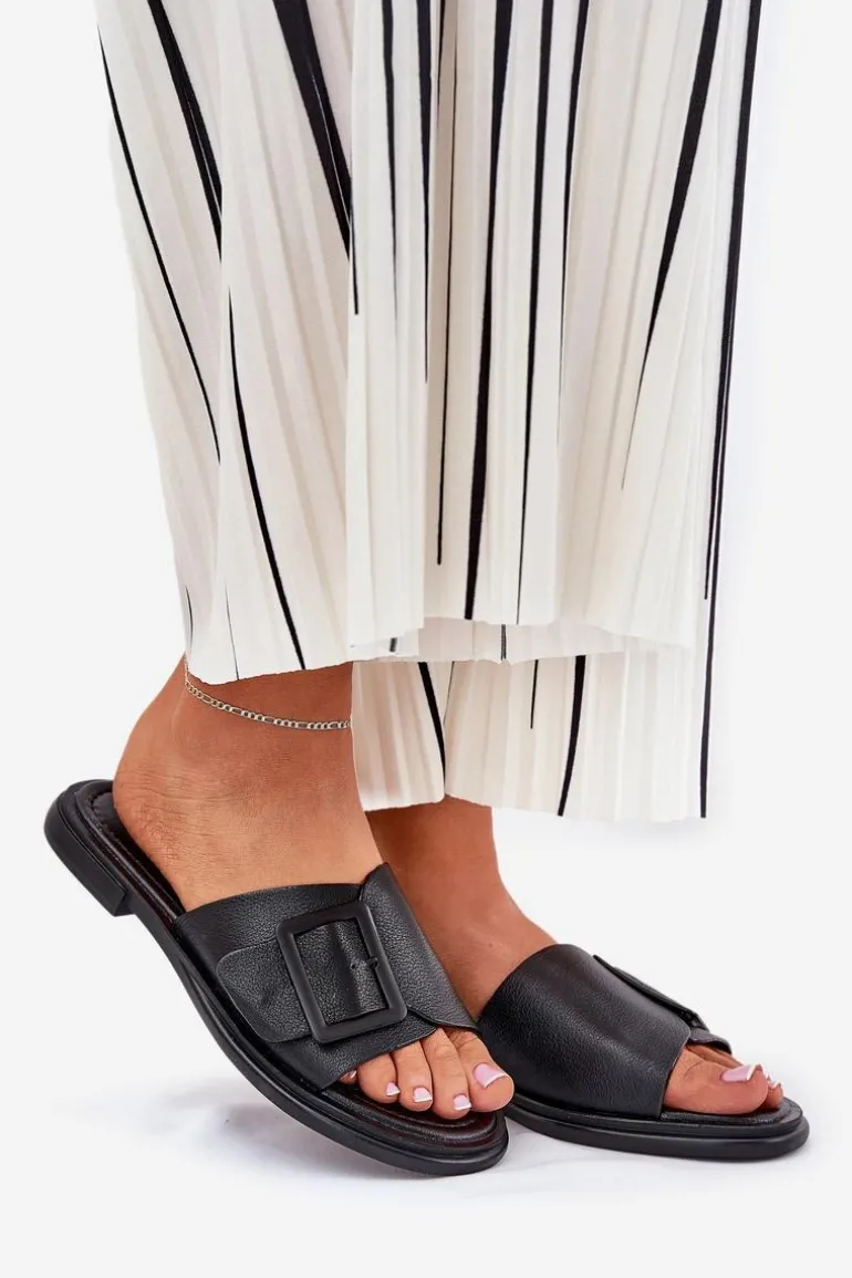Eleganckie klapki damskie z naturalnej skóry, osadzone na płaskim obcasie, które łączą komfort z prostym stylem. Z przodu duża klamra, która dodaje im wyjątkowego charakteru. Skórzana wkładka zapewnia wygodę przez cały dzień, dbając o odpowiednią amortyzację. Doskonałe na letnie dni, te klapki będą idealnym wyborem do codziennych stylizacji, wprowadzając do nich lekkość i elegancję. Przy wyborze rozmiaru prosimy sugerować się tabelą rozmiarów.