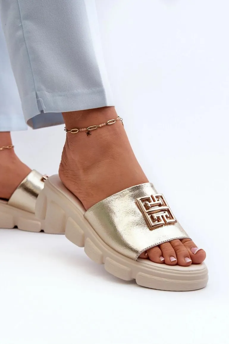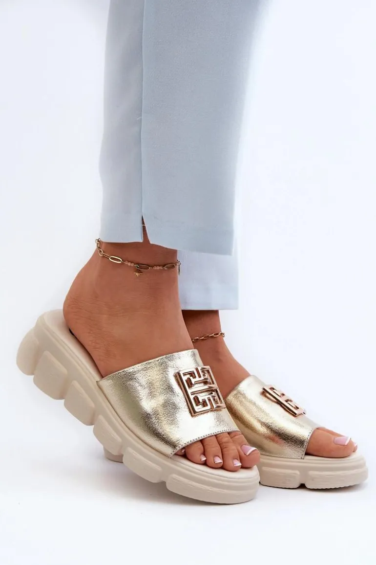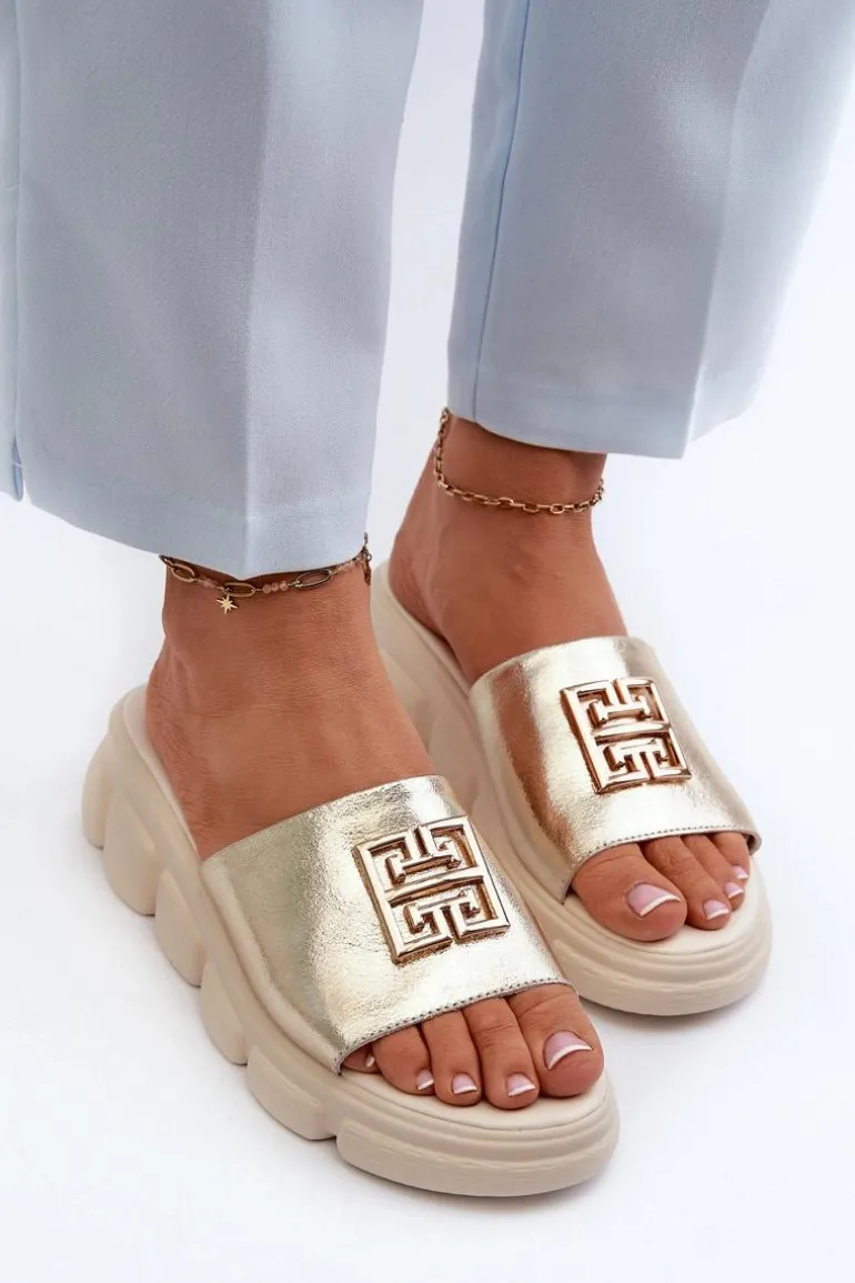Damskie klapki marki Vinceza. Osadzone na koturnie zapewniają stabilność i wygodę podczas noszenia. Wykonane z naturalnej skóry. Z przodu złota ozdoba dodaje im subtelnego blasku. Lekki model, który nie tylko podkreśli Twoją stylizację, ale także doda jej szczypty elegancji. Przy wyborze rozmiaru prosimy sugerować się tabelą rozmiarów.