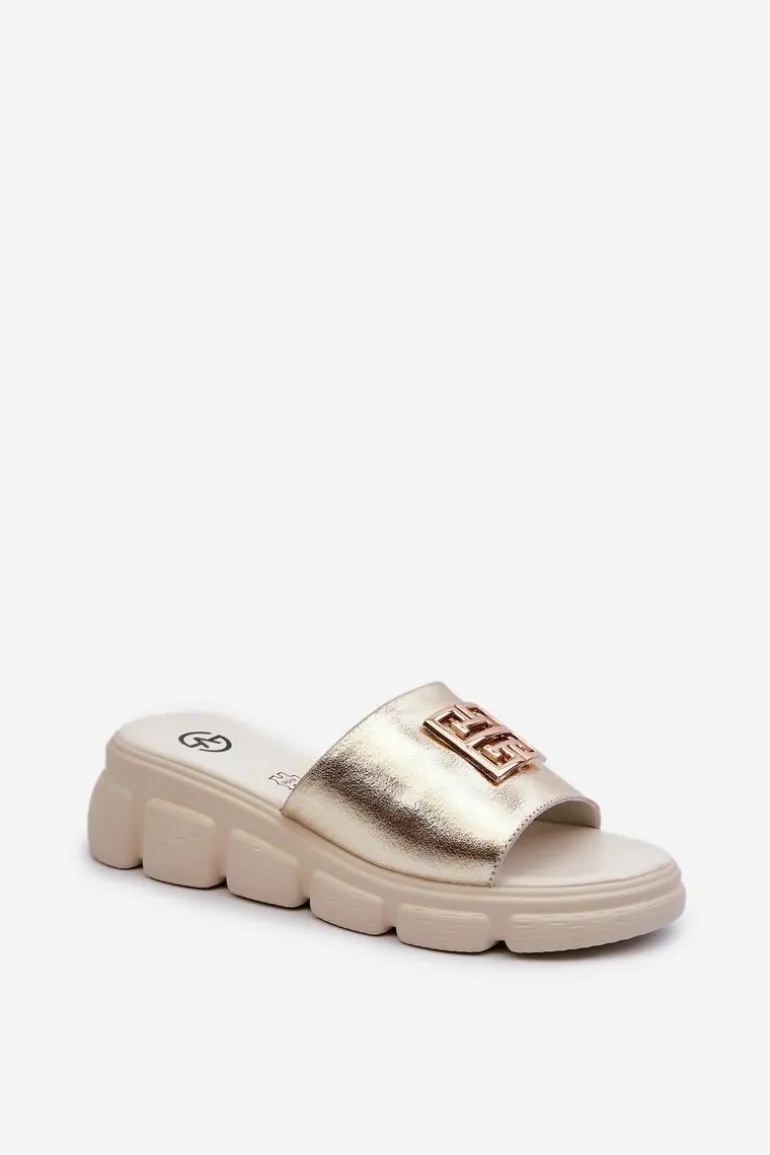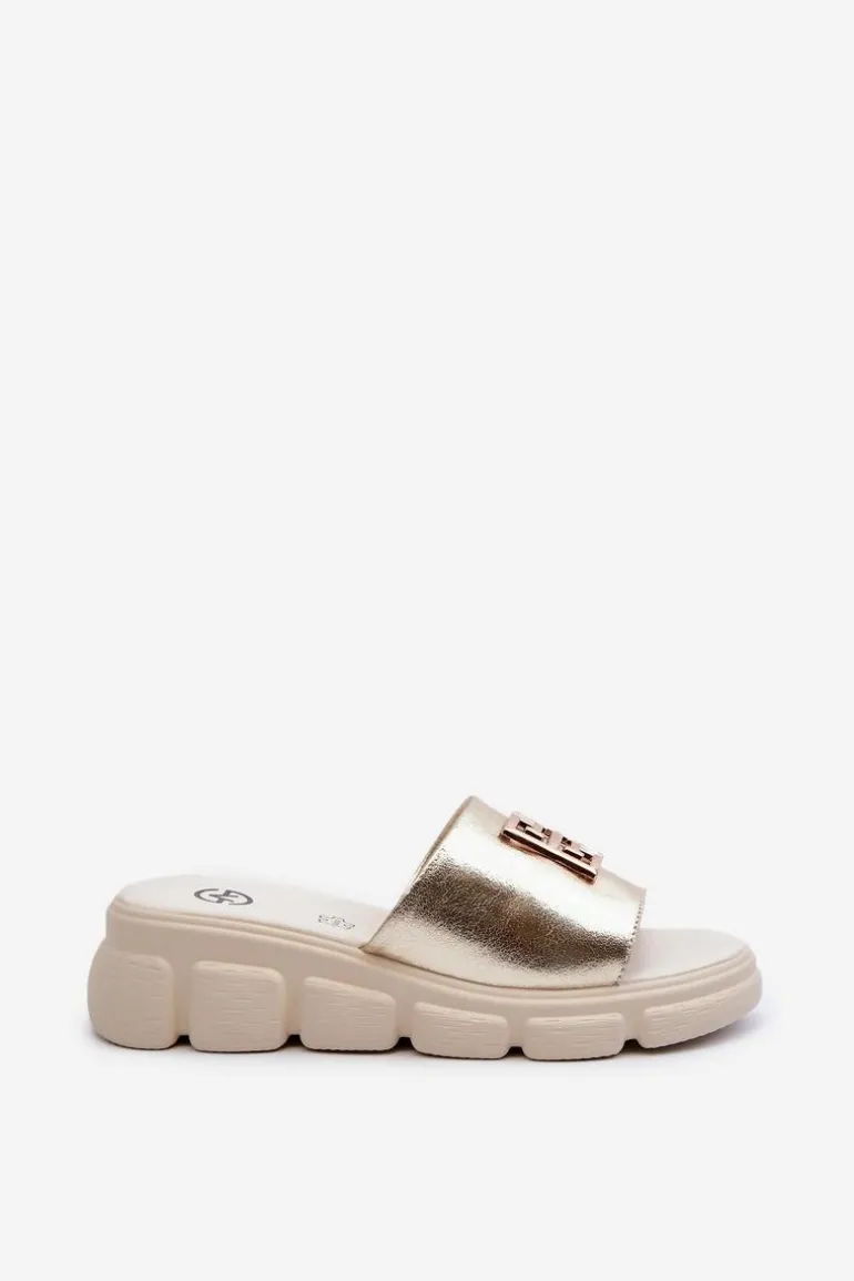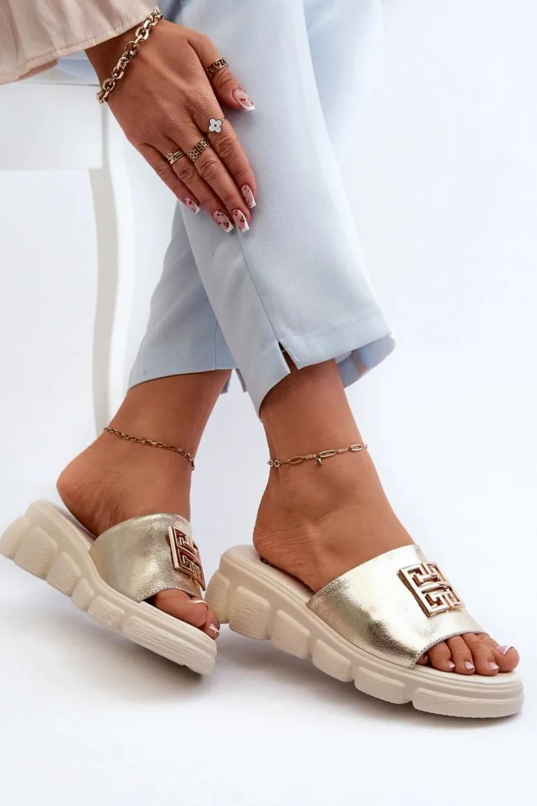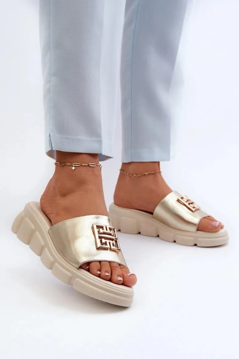 Damskie klapki marki Vinceza. Osadzone na koturnie zapewniają stabilność i wygodę podczas noszenia. Wykonane z naturalnej skóry. Z przodu złota ozdoba dodaje im subtelnego blasku. Lekki model, który nie tylko podkreśli Twoją stylizację, ale także doda jej szczypty elegancji. Przy wyborze rozmiaru prosimy sugerować się tabelą rozmiarów.