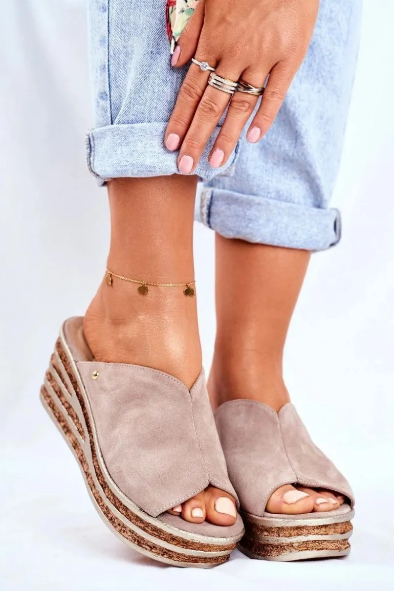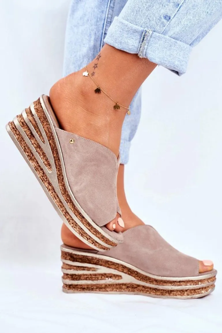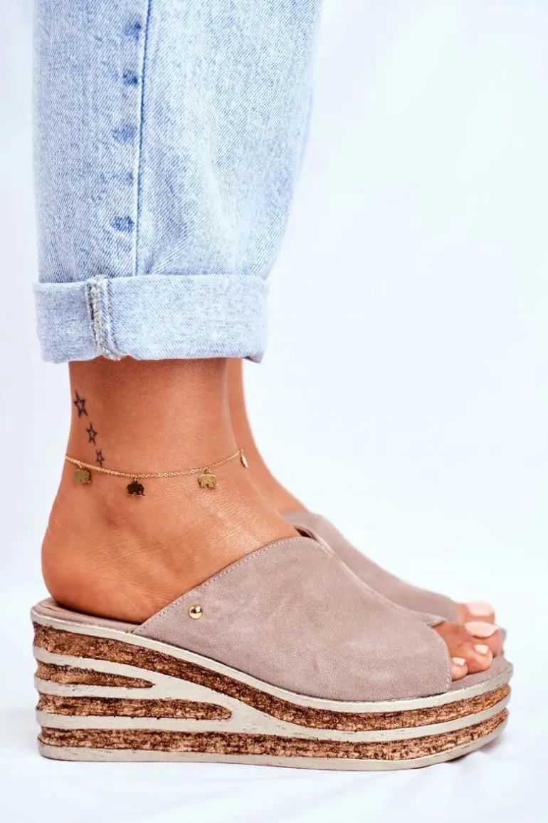 Skórzane Klapki Na Koturnie Cappuccino Nicole 2559