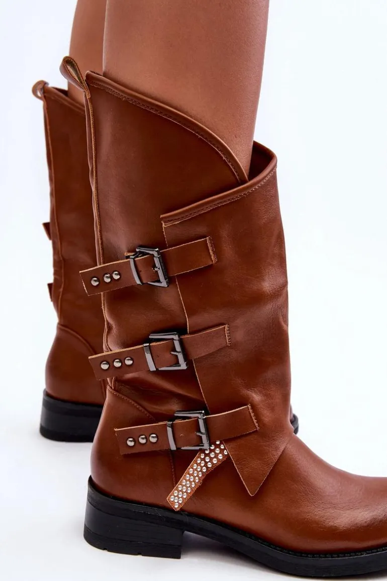 Klasyczne kozaki damskie wykonane z eko skóry. Osadzone na płaskim obcasie. Fason do połowy łydki zapinany na zamek. Miękka, materiałowa wkładka zapewni komfortowe użytkowanie. Na nieregularnej cholewce znajdują się ozdobne paski ze sprzączką. Przy wyborze rozmiaru prosimy kierować tabelą rozmiarów.