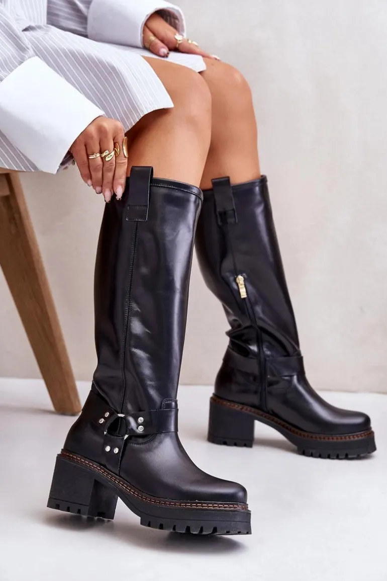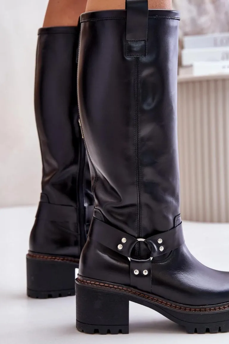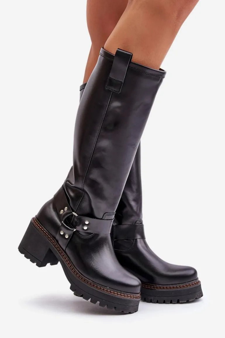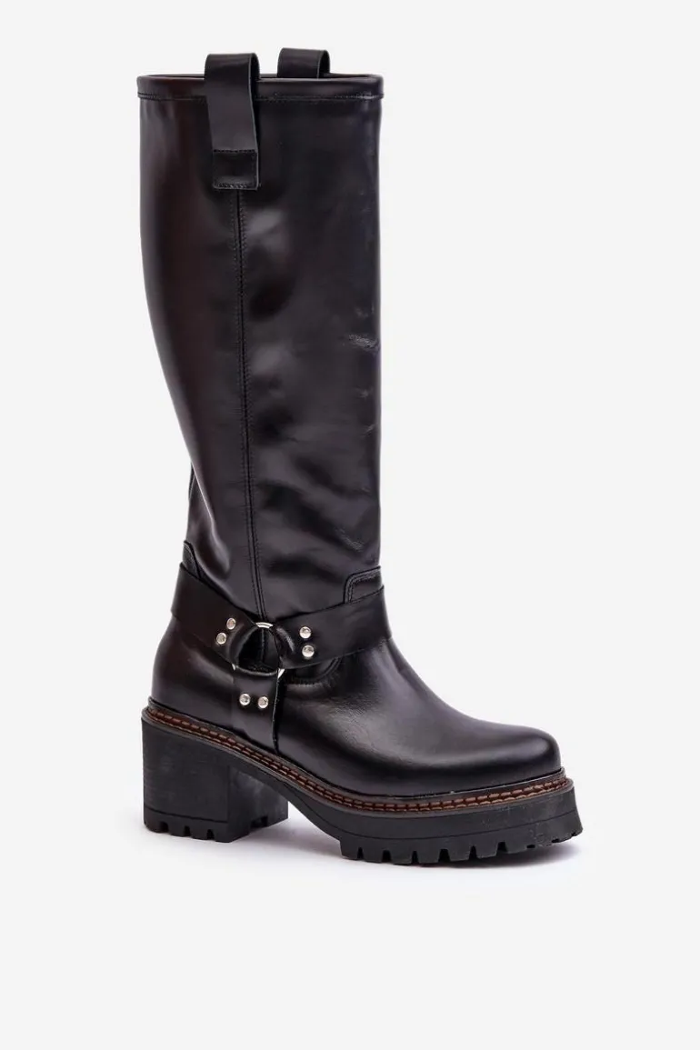Kozaki damskie wykonane z wysokiej jakości skóry naturalnej. Osadzone na masywnym obcasie i platformie, co zapewni stabilność na każdym kroku. Noski zaokrąglone. Model wsuwany oraz dodatkowo posiada zapięcie na zamek. Nie posiadają ocieplenia. Ten elegancki fason świetnie sprawdzi się w wielu stylizacjach! Przy wyborze rozmiaru prosimy sugerować się tabelą rozmiarów.