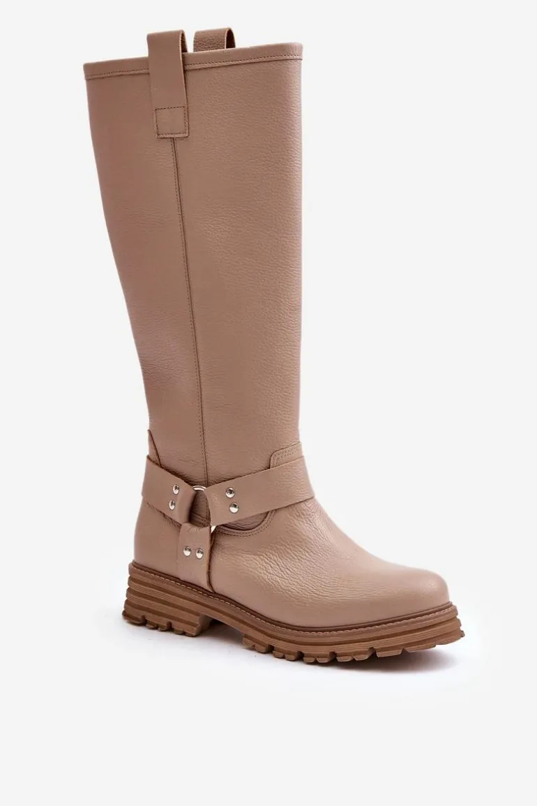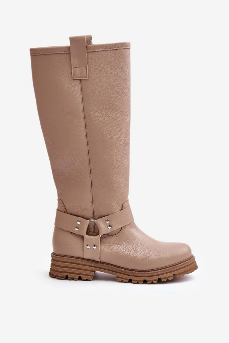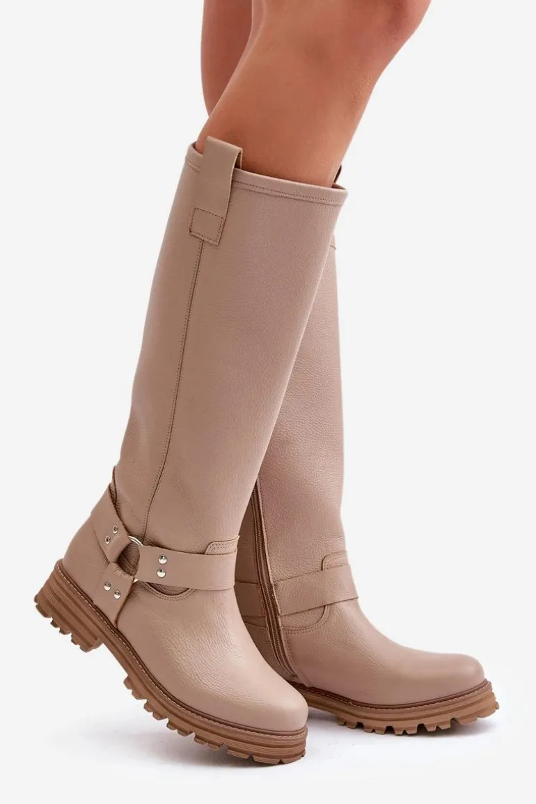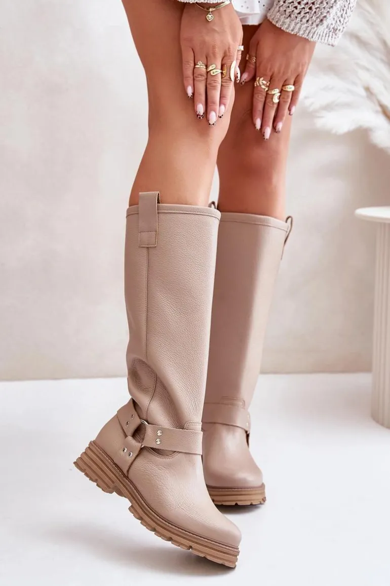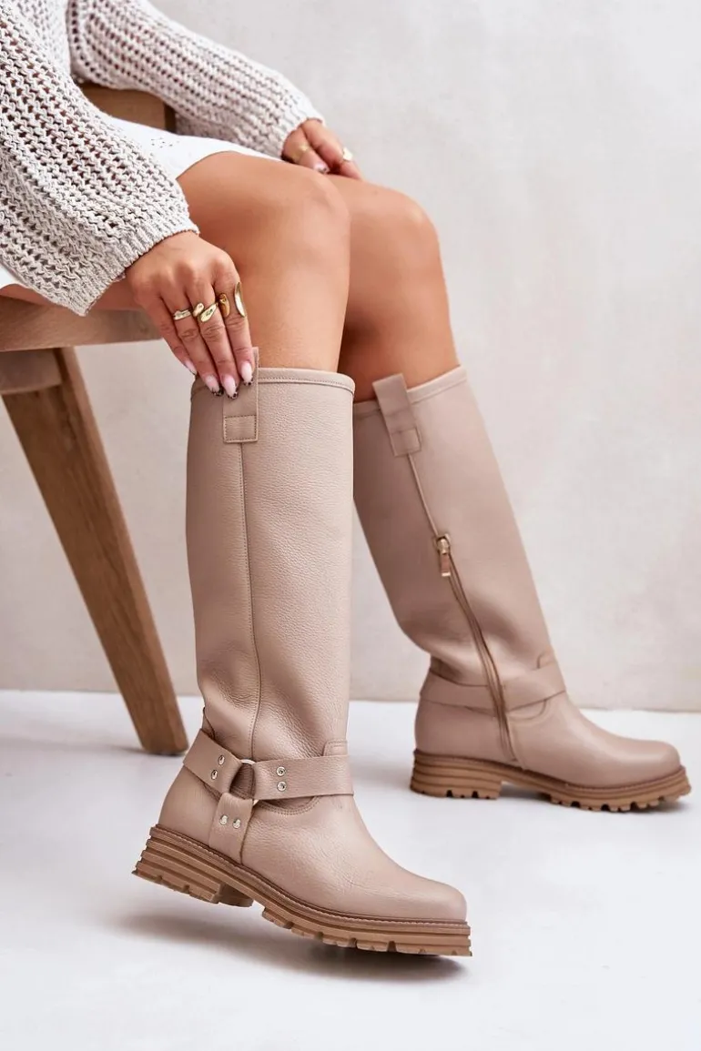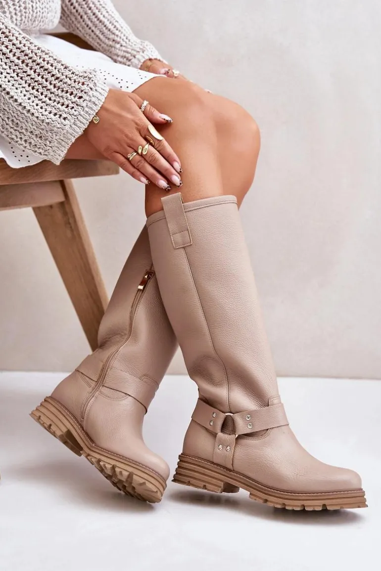 Kozaki damskie z naturalnej skóry to połączenie elegancji i wygody. Osadzone na płaskim obcasie, zapewniają komfort noszenia przez cały dzień. Cholewka sięga przed kolano, co dodaje szyku i świetnie komponuje się z różnymi stylizacjami. Zaokrąglone noski nadają im subtelnego wyglądu. Model wsuwany z praktycznym zapięciem na zamek ułatwia zakładanie, a ozdobne paski na cholewce dodają charakteru. Idealne na co dzień i wyjątkowe okazje, te kozaki będą doskonałym uzupełnieniem Twojej garderoby! Przy wyborze rozmiaru prosimy sugerować się tabelą rozmiarów.