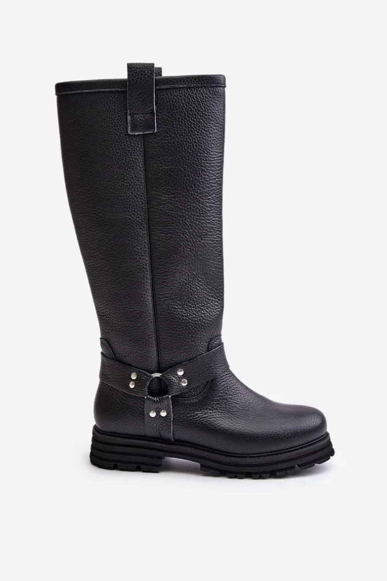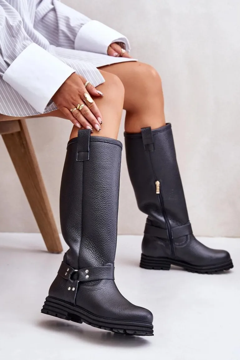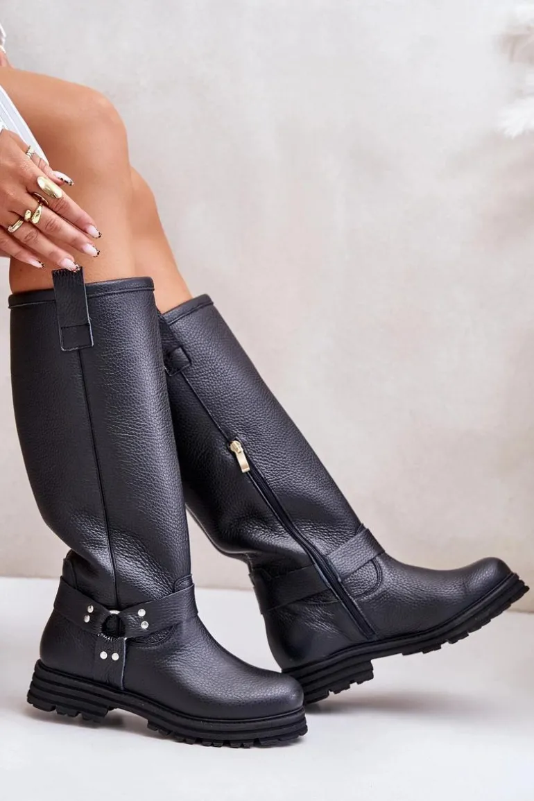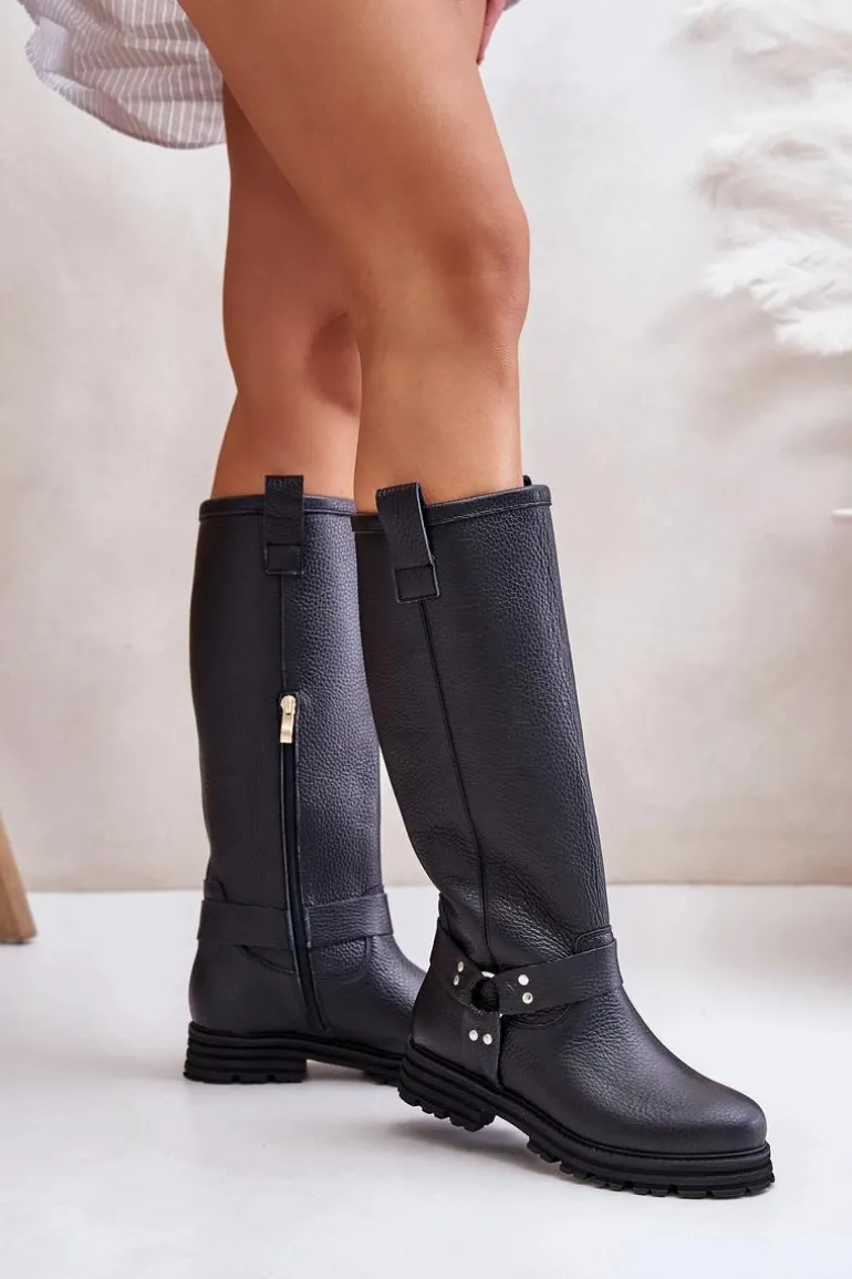 Kozaki damskie z naturalnej skóry to połączenie elegancji i wygody. Osadzone na płaskim obcasie, zapewniają komfort noszenia przez cały dzień. Cholewka sięga przed kolano, co dodaje szyku i świetnie komponuje się z różnymi stylizacjami. Zaokrąglone noski nadają im subtelnego wyglądu. Model wsuwany z praktycznym zapięciem na zamek ułatwia zakładanie, a ozdobne paski na cholewce dodają charakteru. Idealne na co dzień i wyjątkowe okazje, te kozaki będą doskonałym uzupełnieniem Twojej garderoby! Przy wyborze rozmiaru prosimy sugerować się tabelą rozmiarów.