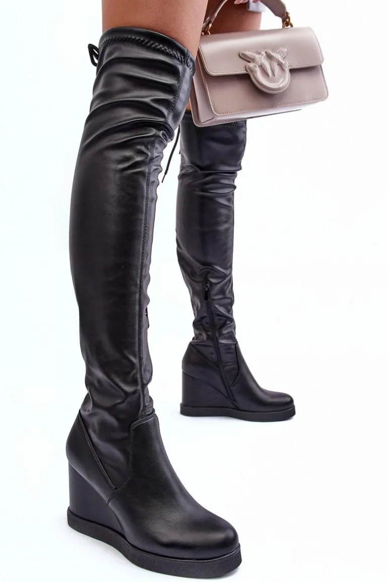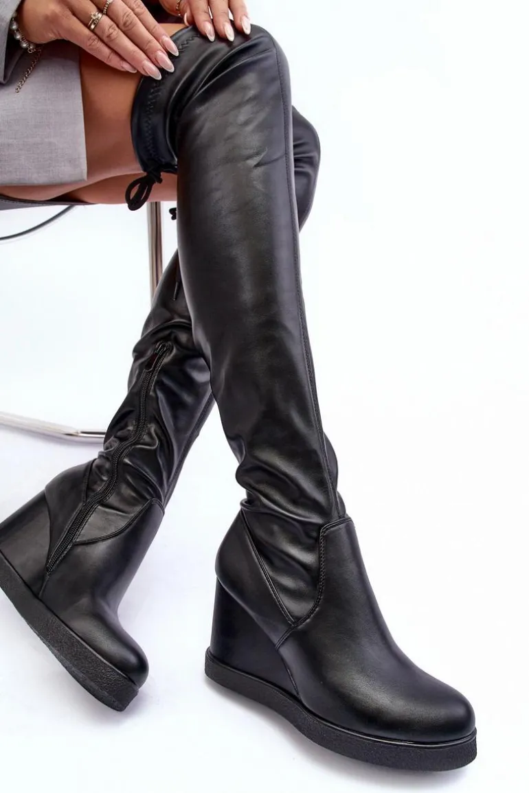 Kozaki damskie z wiązaną cholewką za kolano. Osadzone na koturnie i platformie. Model wsuwany, z dodatkowym suwakiem z boku cholewki. Zapiętek jest usztywniony. Ocieplenie na wysokości stopy. Ten wyjątkowy fason zachwyci każdego! Przy wyborze rozmiaru prosimy sugerować się tabelą rozmiarów.