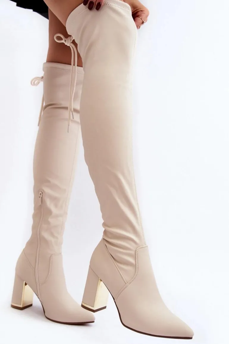 Kozaki damskie z cholewką za kolano. Wykonane z eko skóry. Osadzone na obcasie w postaci słupka, który wzbogacony został lustrzanym elementem. Na górze cholewki znajduje się wiązanie. Model wsuwany z dodatkowym suwakiem. W środku ocieplone na wysokości stopy. Idealny model do sukienek mini czy spódniczek. Koniecznie powinnaś je mieć! Przy wyborze rozmiaru prosimy sugerować się tabelą rozmiarów.