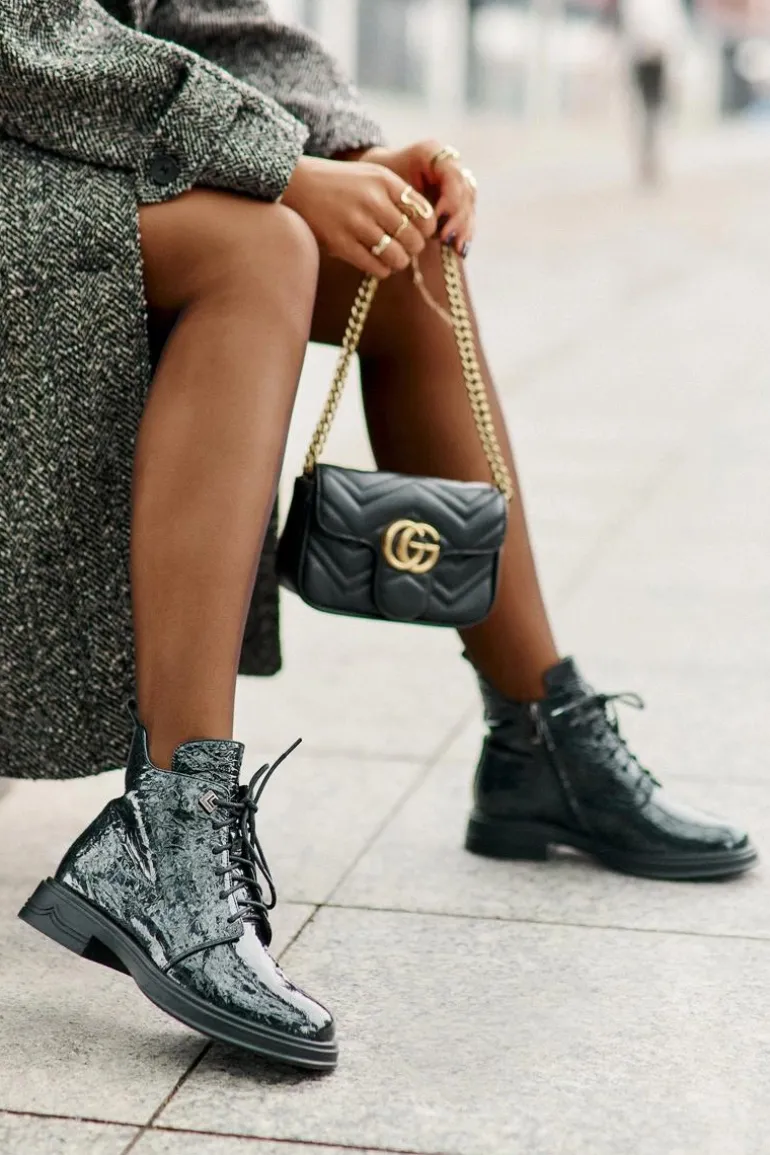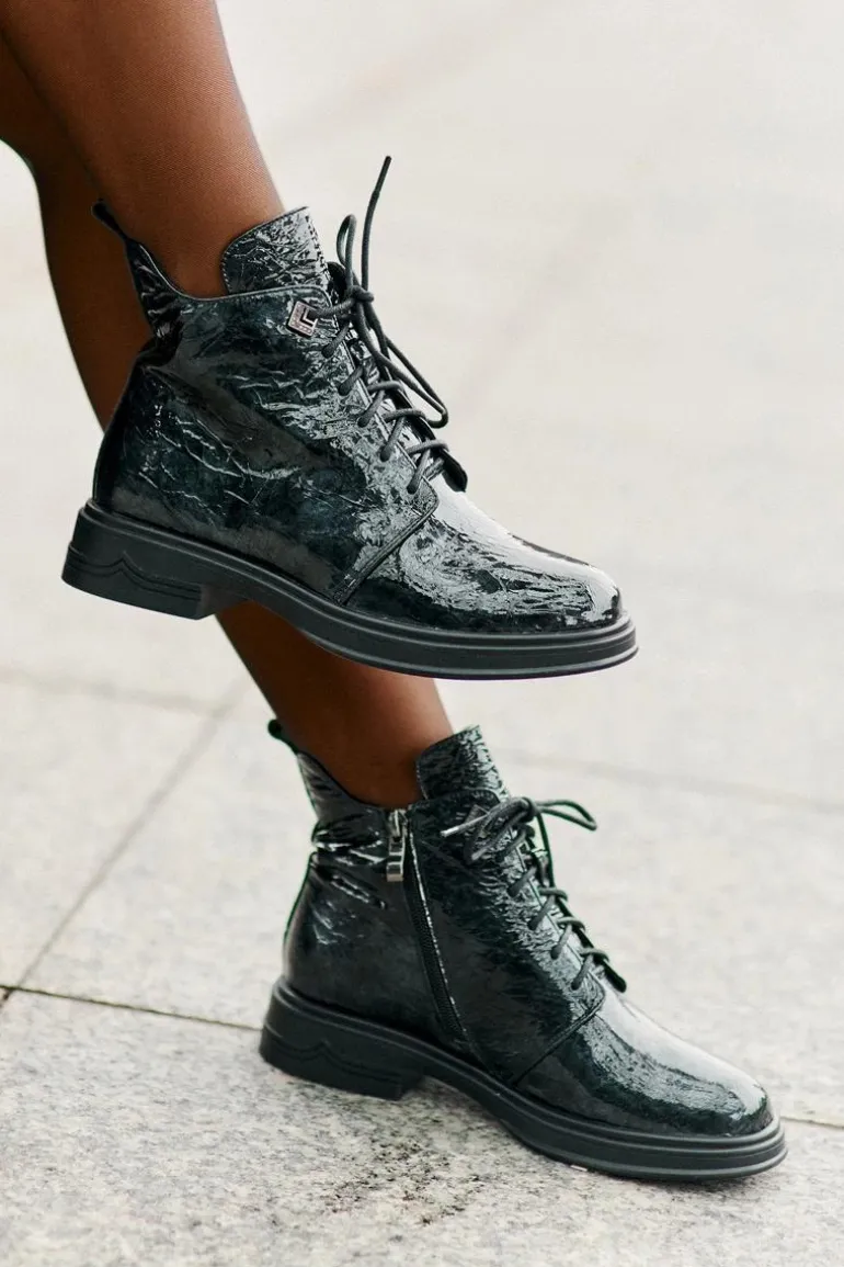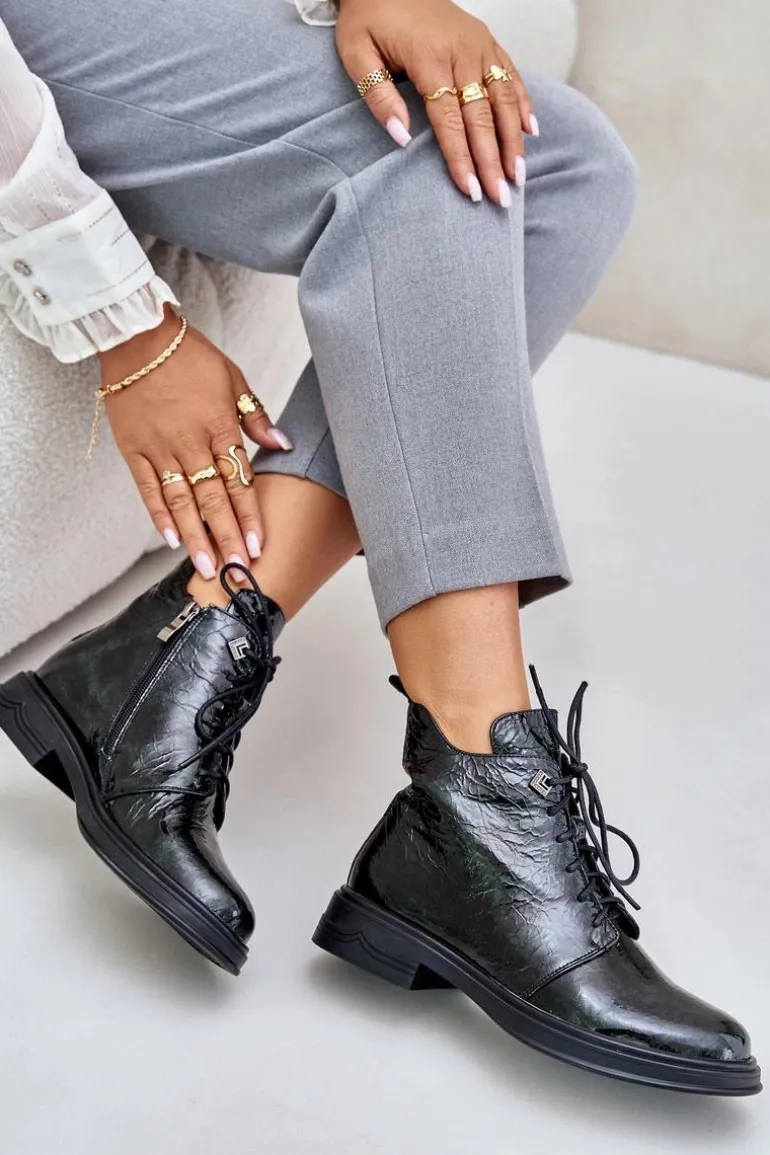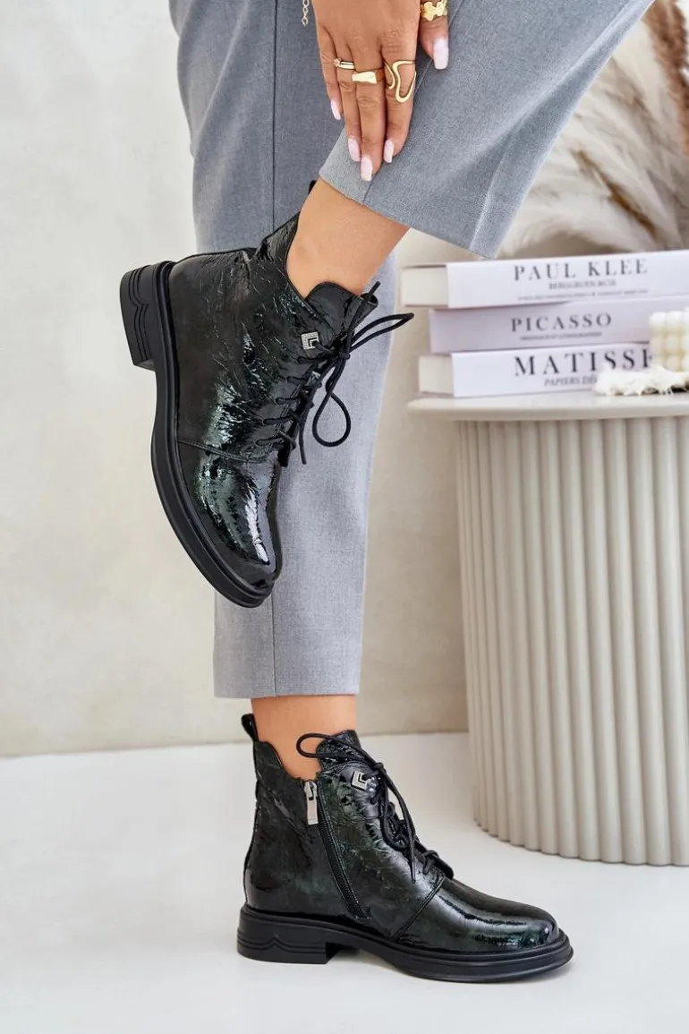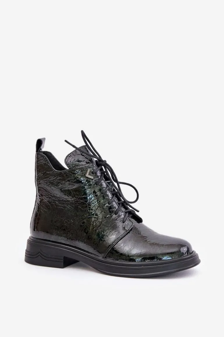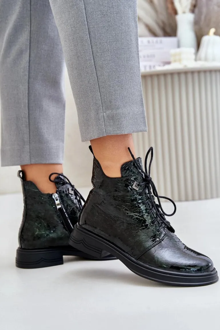 Eleganckie botki wykonane z naturalnej skóry to stylowy wybór na chłodniejsze dni. Osadzone na płaskim obcasie, zapewniają wygodę, a połączenie sznurowania i zamka ułatwia ich zakładanie oraz dopasowanie do stopy. Tłoczenia na cholewce dodają im wyrafinowanego, oryginalnego wyglądu. Ocieplane wnętrze gwarantuje ciepło, dzięki czemu te botki doskonale sprawdzą się zarówno w codziennych, jak i bardziej eleganckich stylizacjach. Przy wyborze rozmiaru prosimy sugerować się tabelą rozmiarów.