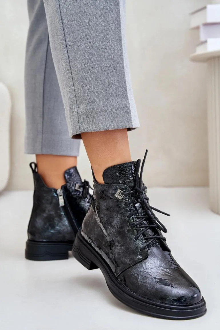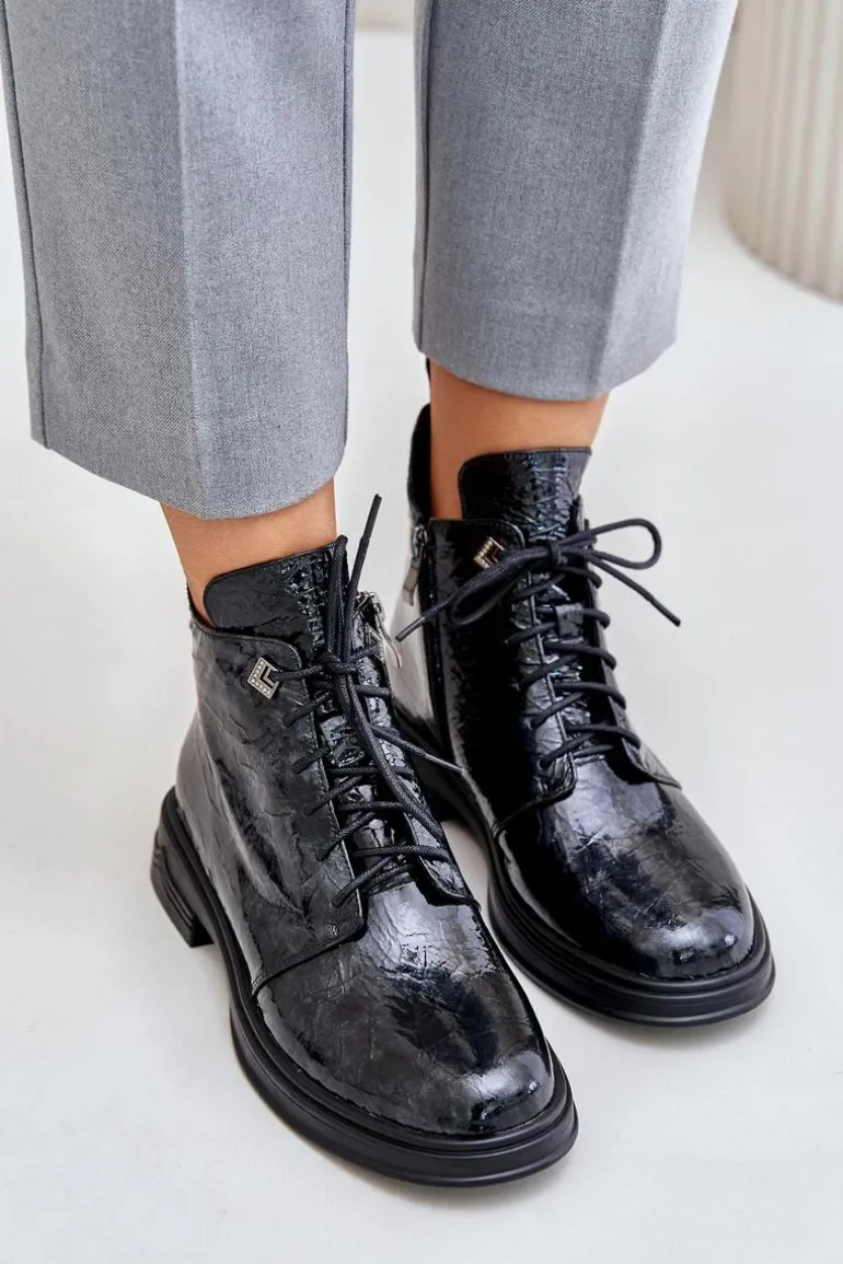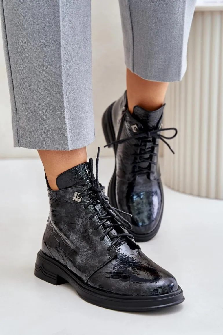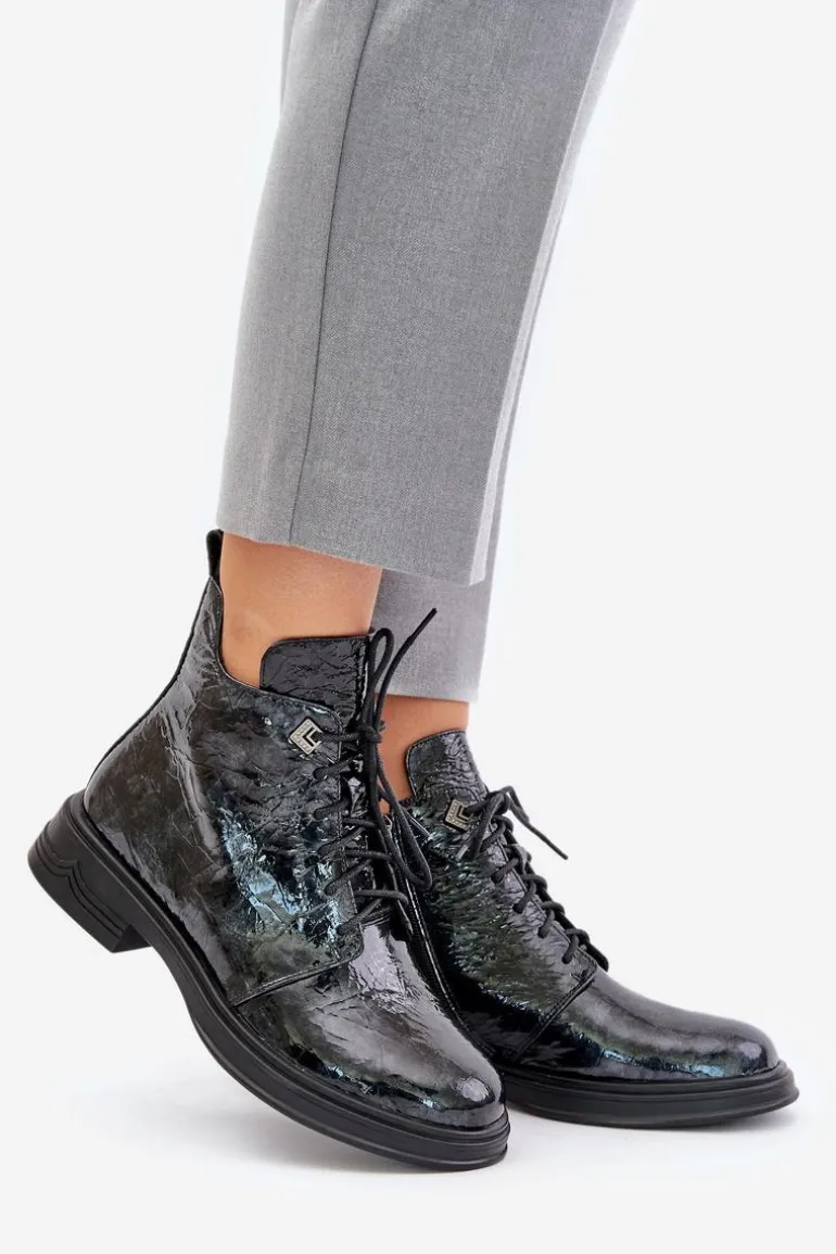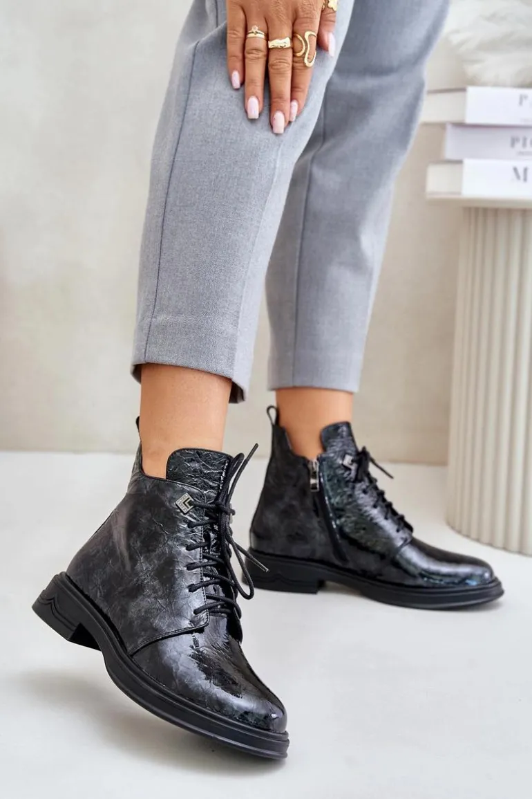 Skórzane Lakierowane Botki Damskie Ocieplane Na Zamek D&A LZ42-042 Czarno-Szare