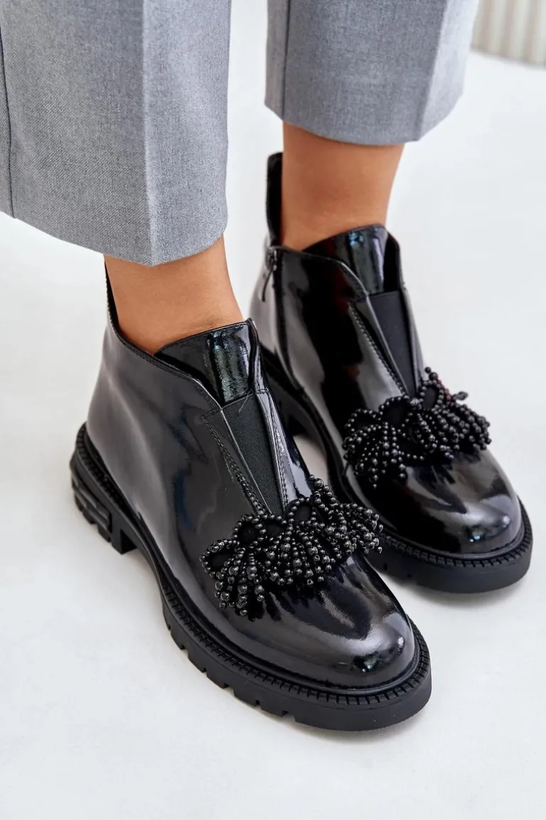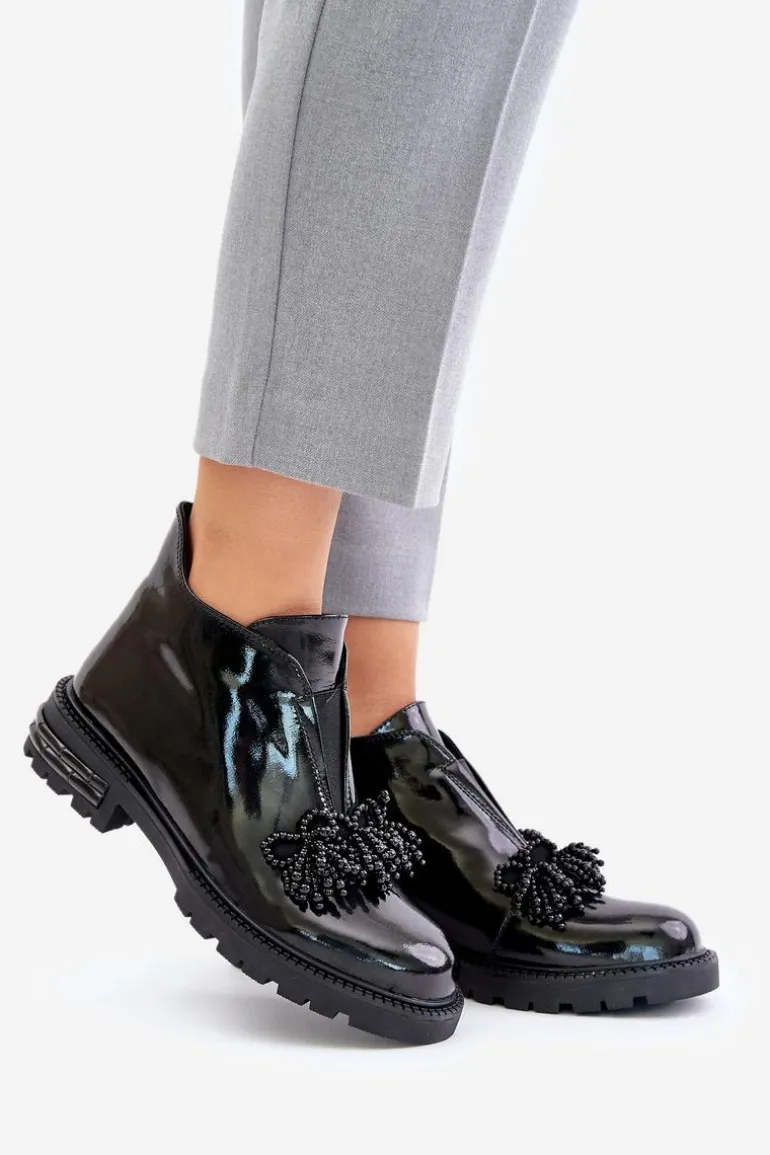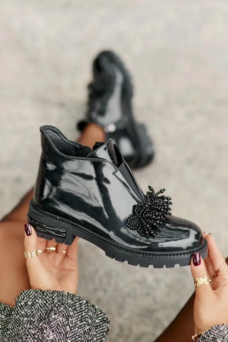 Eleganckie, niskie botki wykonane z naturalnej skóry to doskonała propozycja na chłodniejsze dni. Model ocieplany, zapewnia ciepło i komfort noszenia. Zapinane na zamek. Ozdoba z przodu nadaje szykownego charakteru. Zaokrąglone noski oraz płaski obcas gwarantują wygodę, czyniąc te botki idealnym wyborem do codziennych, jak i bardziej eleganckich stylizacji. Przy wyborze rozmiaru prosimy sugerować się tabelą rozmiarów.