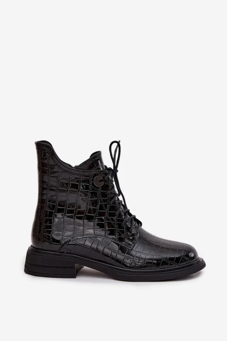 Botki damskie wykonane z naturalnej, lakierowanej skóry to stylowa propozycja na chłodniejsze dni. Połyskujące wykończenie nadaje im eleganckiego i nowoczesnego charakteru. Model zapinany jest na zamek oraz dodatkowo sznurowany, co pozwala na idealne dopasowanie do stopy i wygodne zakładanie. Wnętrze butów zostało ocieplone, dzięki czemu zapewniają ciepło i komfort nawet w zimniejsze dni. To połączenie klasyki i miejskiego szyku – doskonałe do codziennych stylizacji, jak i bardziej eleganckich zestawów. Przy wyborze rozmiaru prosimy sugerować się tabelą rozmiarów.
