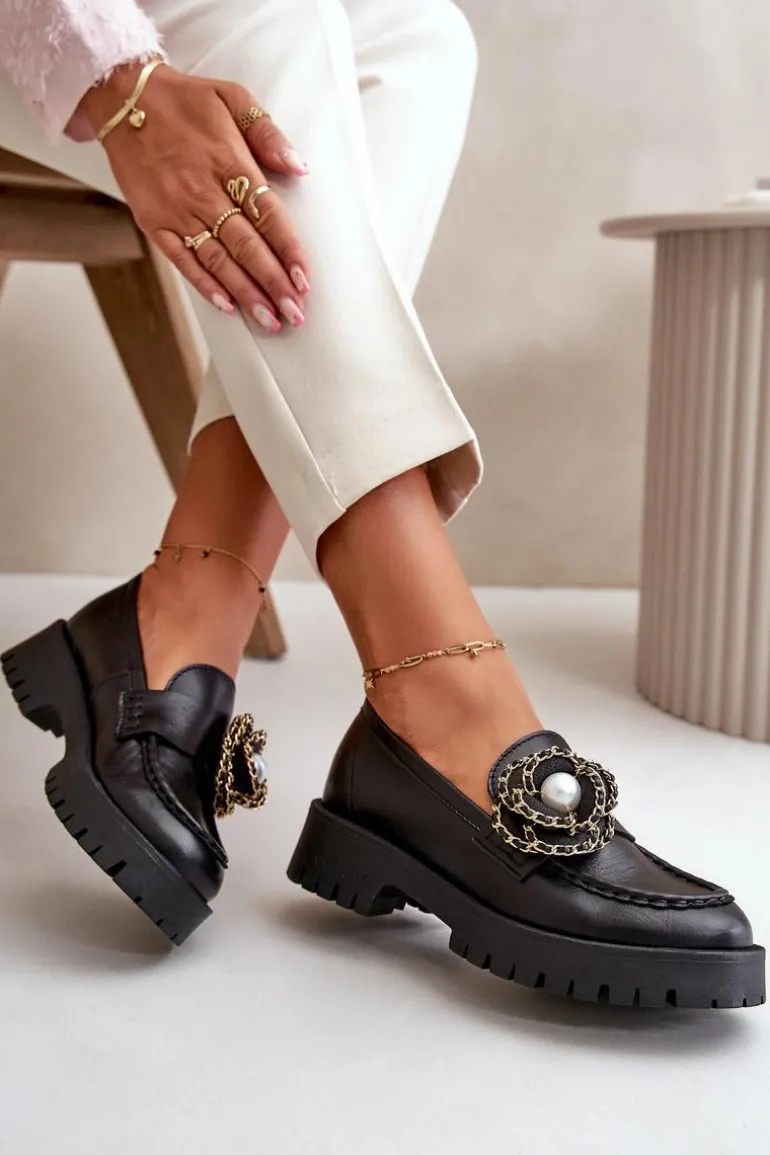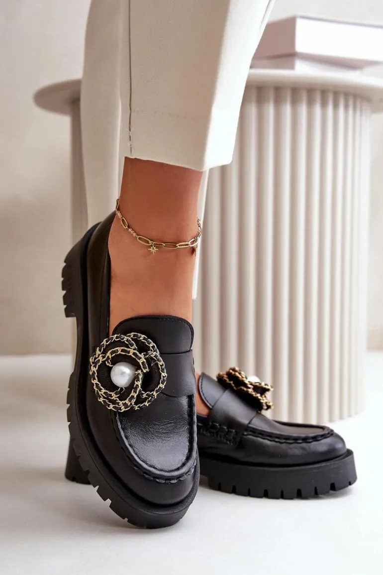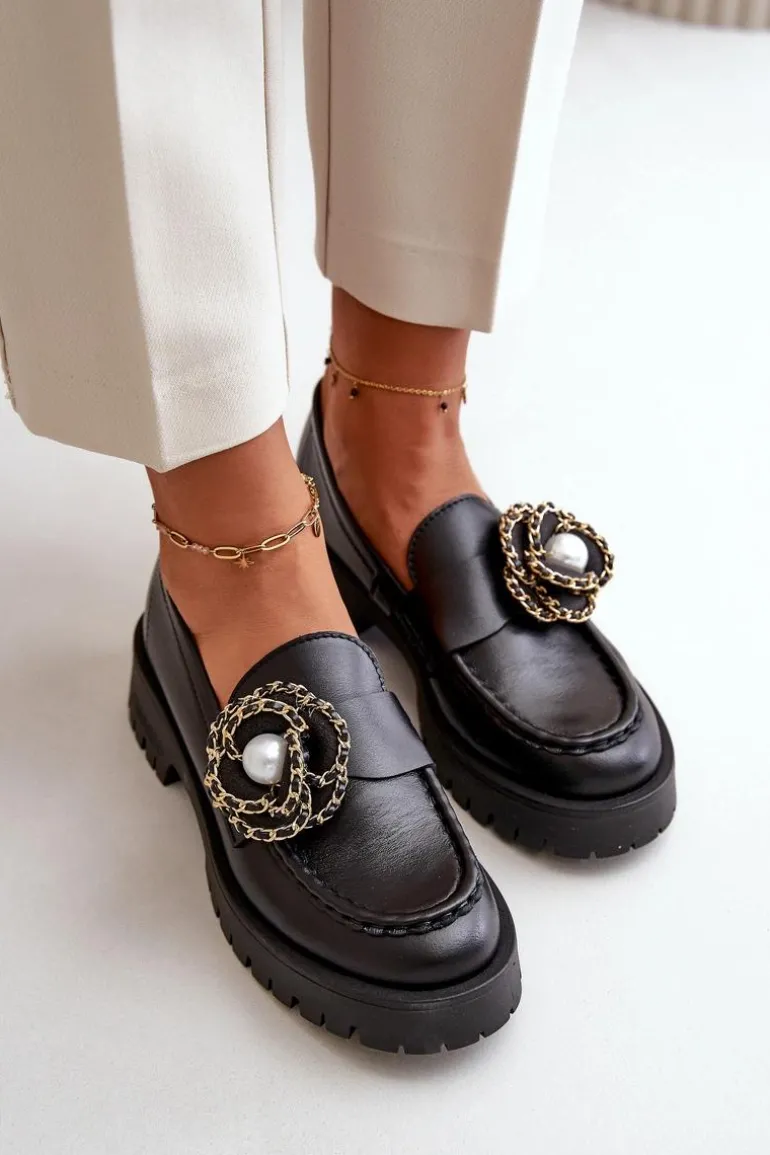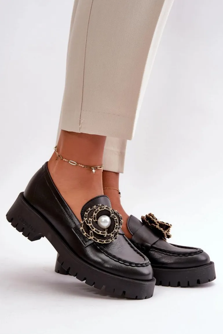 Śliczne damskie mokasyny wykonano z wysokiej jakości skóry naturalnej, gwarantując trwałość i komfort noszenia. Płaski obcas i platforma zapewniają stabilność i wygodę. Skórzana wkładka dodatkowo podnosi komfort noszenia. Ozdobny kwiatek na pasku nadaje subtelny akcent. Model ten doskonale uzupełni wiele stylizacji! Przy wyborze rozmiaru prosimy sugerować się tabelą rozmiarów.