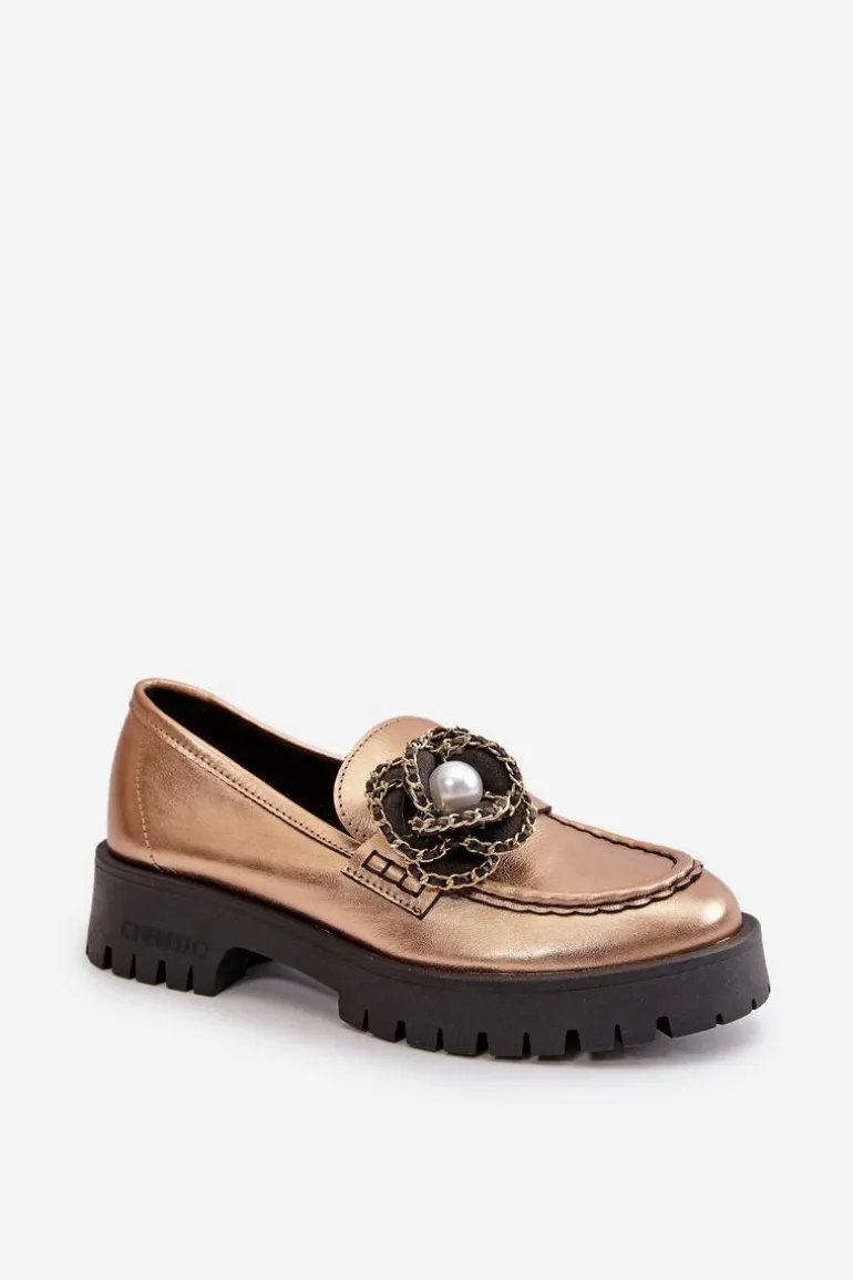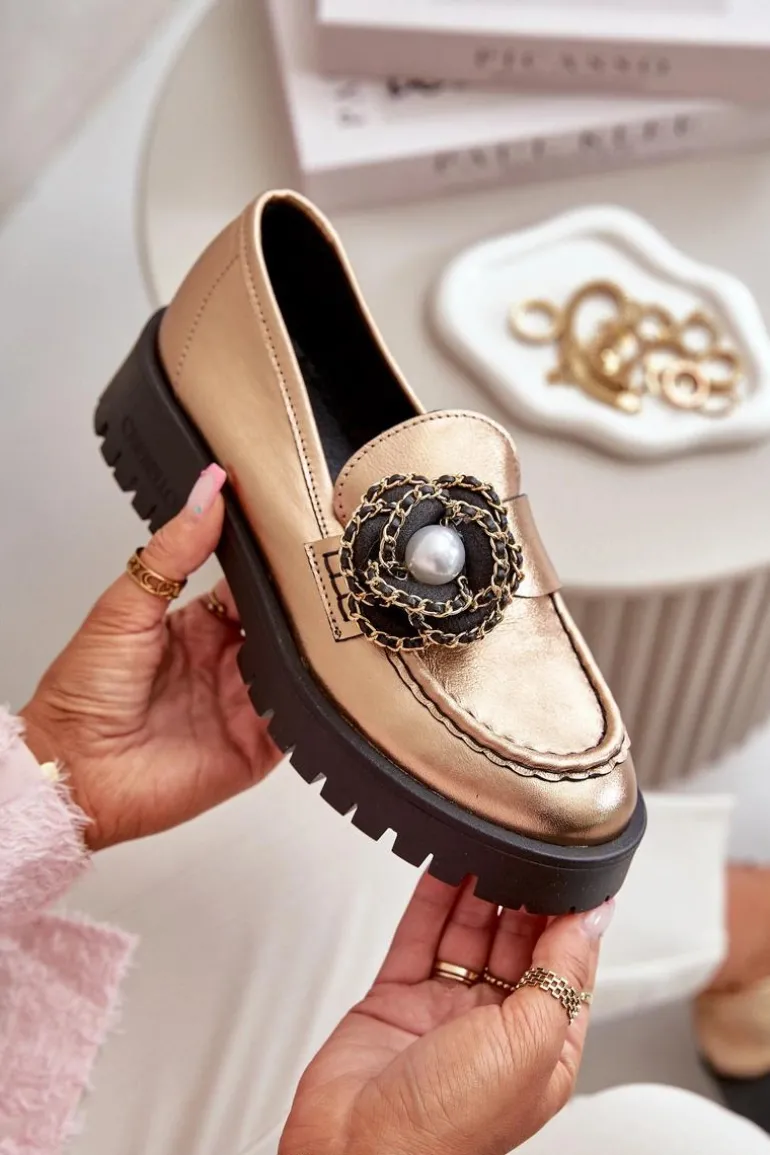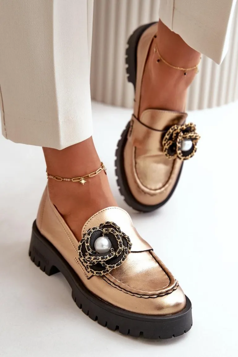 Śliczne damskie mokasyny wykonano z wysokiej jakości skóry naturalnej, gwarantując trwałość i komfort noszenia. Płaski obcas i platforma zapewniają stabilność i wygodę. Skórzana wkładka dodatkowo podnosi komfort noszenia. Ozdobny kwiatek na pasku nadaje subtelny akcent. Model ten doskonale uzupełni wiele stylizacji! Przy wyborze rozmiaru prosimy sugerować się tabelą rozmiarów.