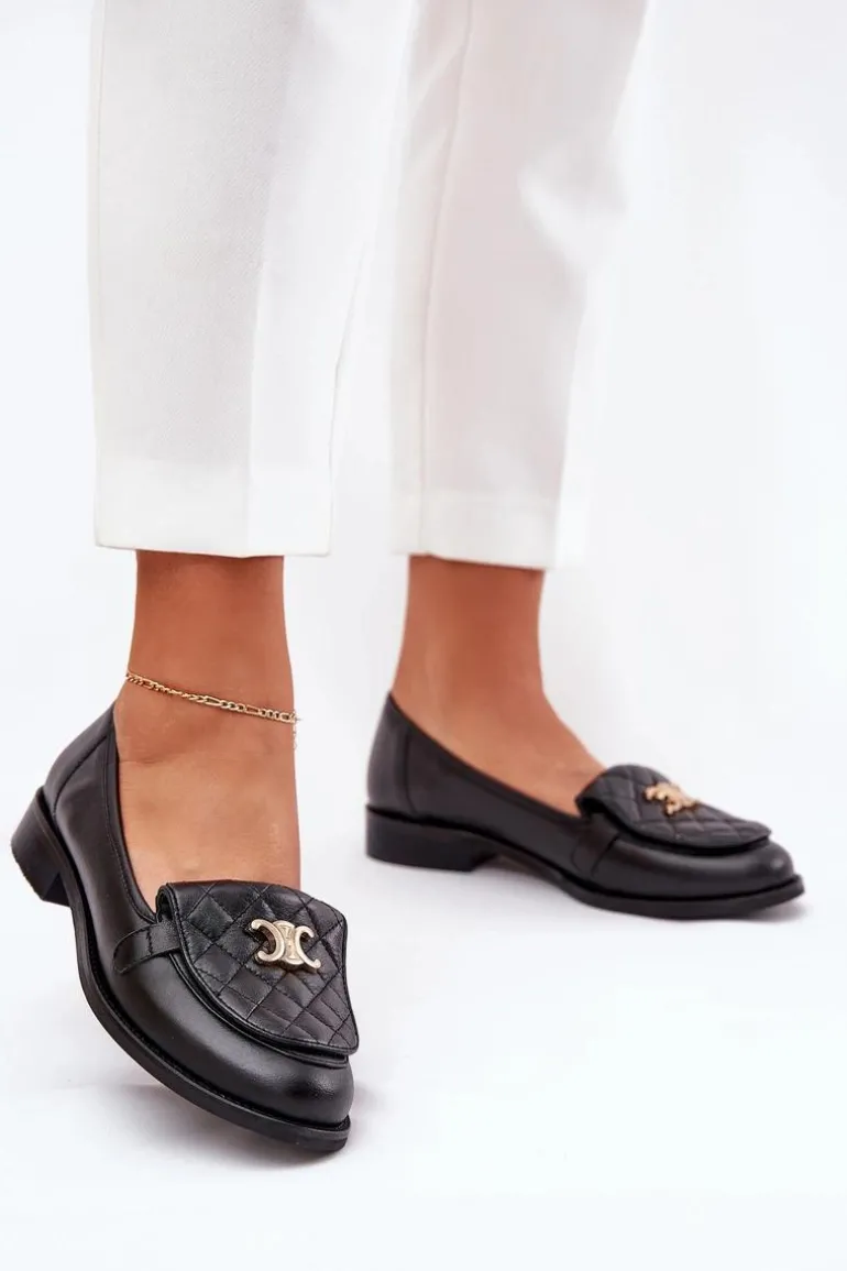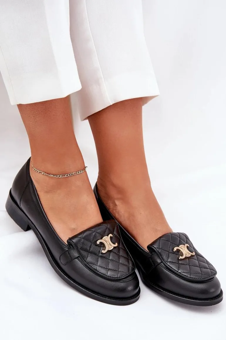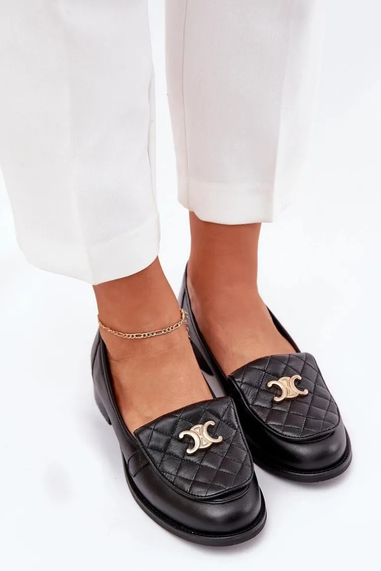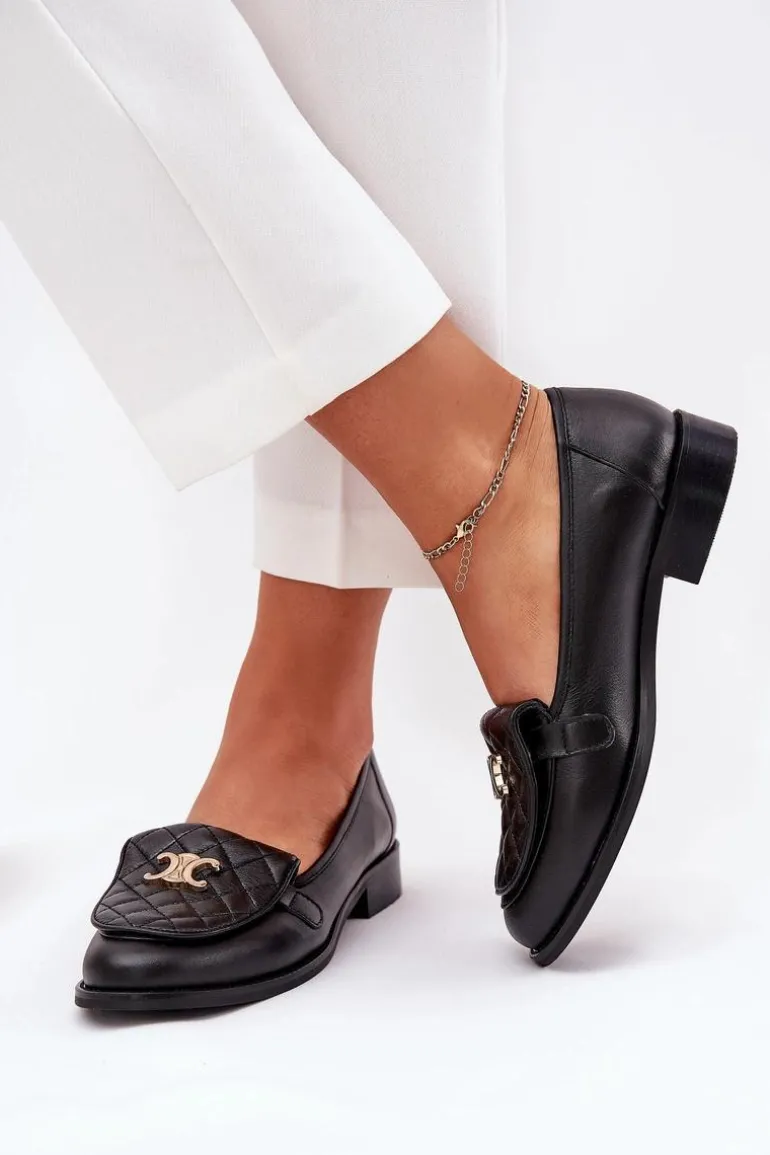 Eleganckie mokasyny damskie wykonane z wysokiej jakości naturalnej skóry. Przód butów zdobią subtelne przeszycia oraz złoty element, który dodaje im szyku i wyjątkowego charakteru. Zaokrąglone noski nadają modelowi klasycznego wyglądu, a skórzana wkładka zapewnia komfort noszenia przez cały dzień. Idealne zarówno do codziennych, jak i bardziej formalnych stylizacji – must-have w garderobie każdej kobiety! Przy wyborze rozmiaru prosimy sugerować się tabelą rozmiarów.