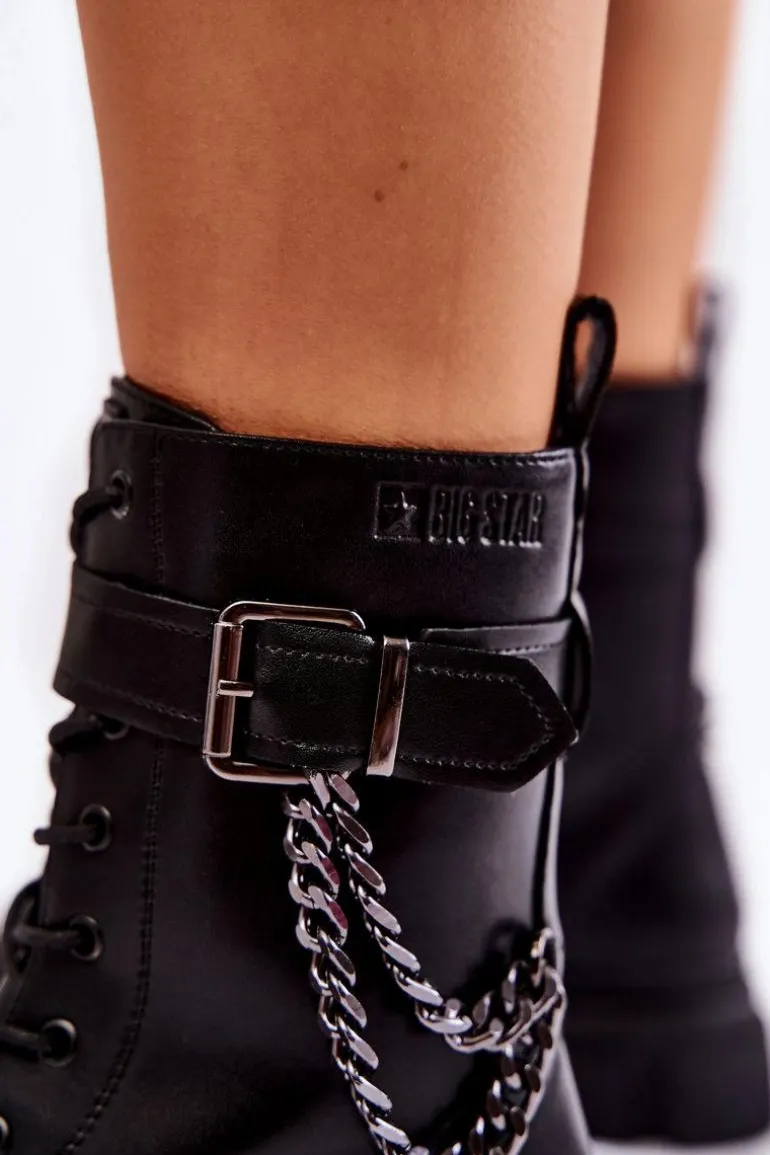 Botki — glany od marki Big Star zostały wykonane z naturalnej skóry. Posiadają klasyczne sznurowanie oraz suwak z boku cholewki. Ozdobny łańcuszek nie jest odpinany, natomiast pasek z klamrą jest regulowany. Botki są w środku ocieplane miękkim w dotyku kocem obuwniczym. Dodatkowo zapiętek w tych butach jest ocieplany. Glany osadzono na płaskim obcasie i platformie. Przy wyborze rozmiaru prosimy sugerować się tabelą rozmiarów.