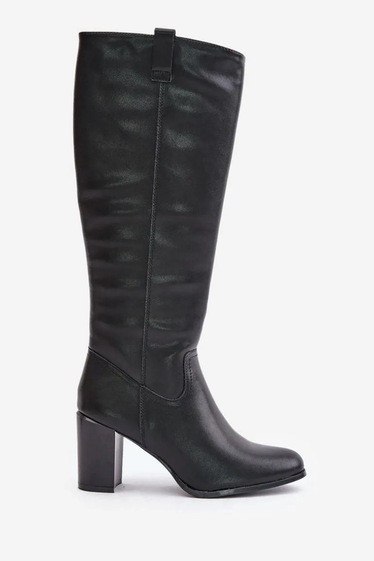 Eleganckie skórzane kozaki przed kolano to doskonała propozycja na chłodniejsze dni. Wykonane ze skóry naturalnej. Ocieplane wnętrze zapewnia ciepło i komfort. Model zapinany na zamek dla wygody zakładania. Obcas słupek dodaje stylowego podkreślenia sylwetki. Noski w migdał. Ten elegancki fason idealnie dopełni stylizacje z sukienkami i spódnicami! Przy wyborze rozmiaru prosimy sugerować się tabelą rozmiarów.