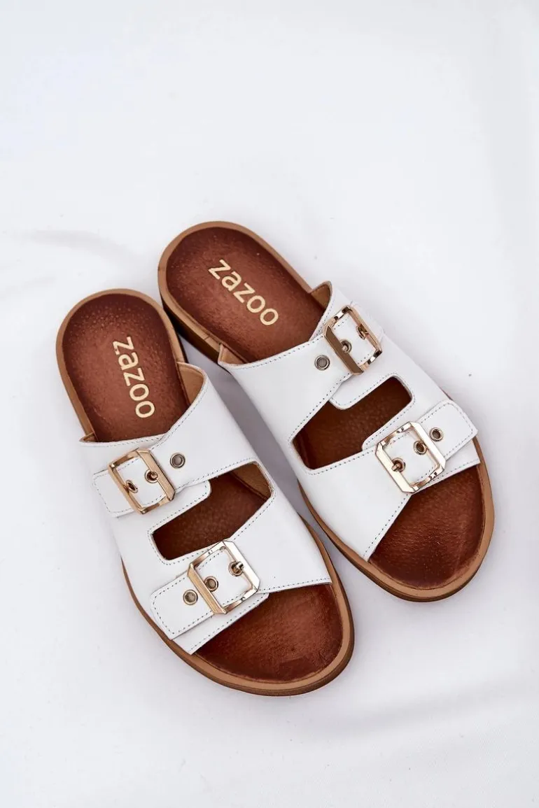 Skórzane klapki damskie na płaskim obcasie to elegancka propozycja, która łączy komfort z nowoczesnym stylem. Posiadają dwie złote klamry z regulowanymi paskami, które nie tylko zapewniają idealne dopasowanie do stopy, ale również stanowią modny akcent, dodający subtelnego blasku. Dzięki płaskiemu obcasowi klapki te są wygodne i stabilne, idealne na co dzień, zarówno do casualowych, jak i bardziej eleganckich stylizacji. Skórzana cholewka gwarantuje trwałość i komfort, sprawiając, że te klapki będą doskonałym wyborem na upalne dni. Przy wyborze rozmiaru prosimy sugerować się tabelą rozmiarów.