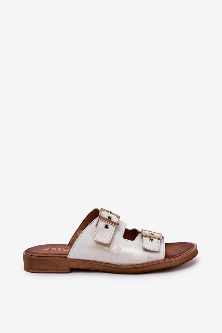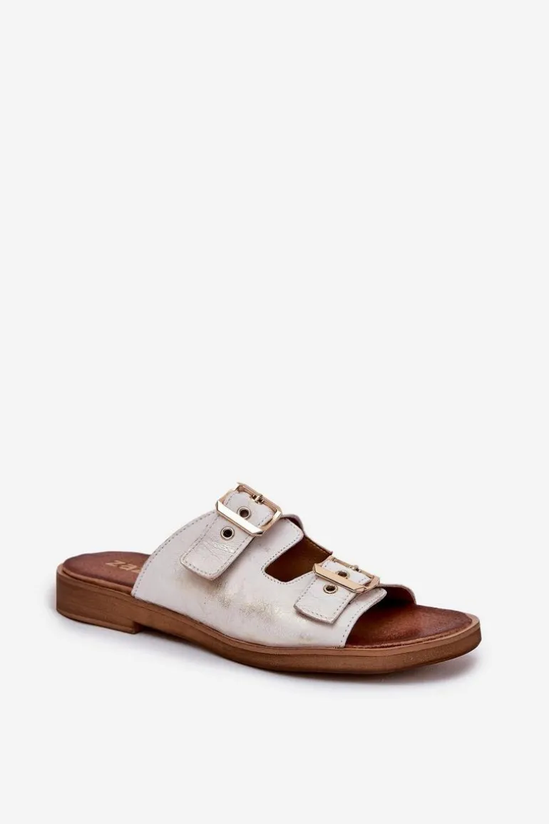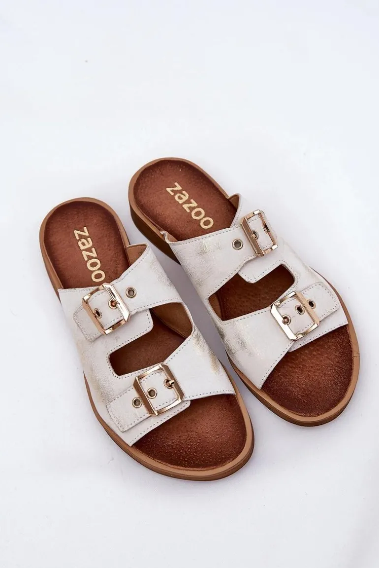 Skórzane Płaskie Klapki Z Klamrami Zazoo 3020 Złoty Przecierany