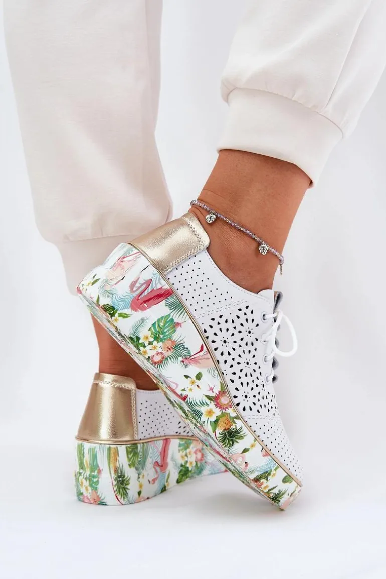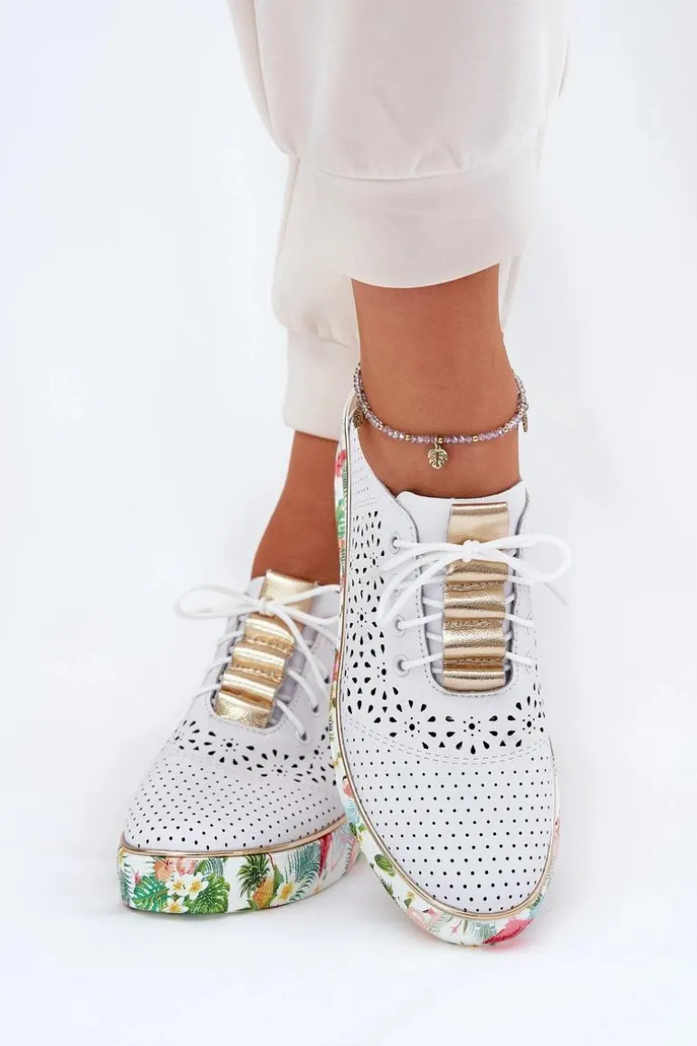 Półbuty damskie wykonane z naturalnej skóry. Osadzone na platformie i koturnie z kwiecistym wzorem. Noski zaokrąglone. Ażurowa cholewka nadaje lekkości i wyjątkowego uroku. Model sznurowany. Lekkie i wygodne, doskonałe do wiosenno-letnich stylizacji! Przy wyborze rozmiaru prosimy sugerować się tabelą rozmiarów.