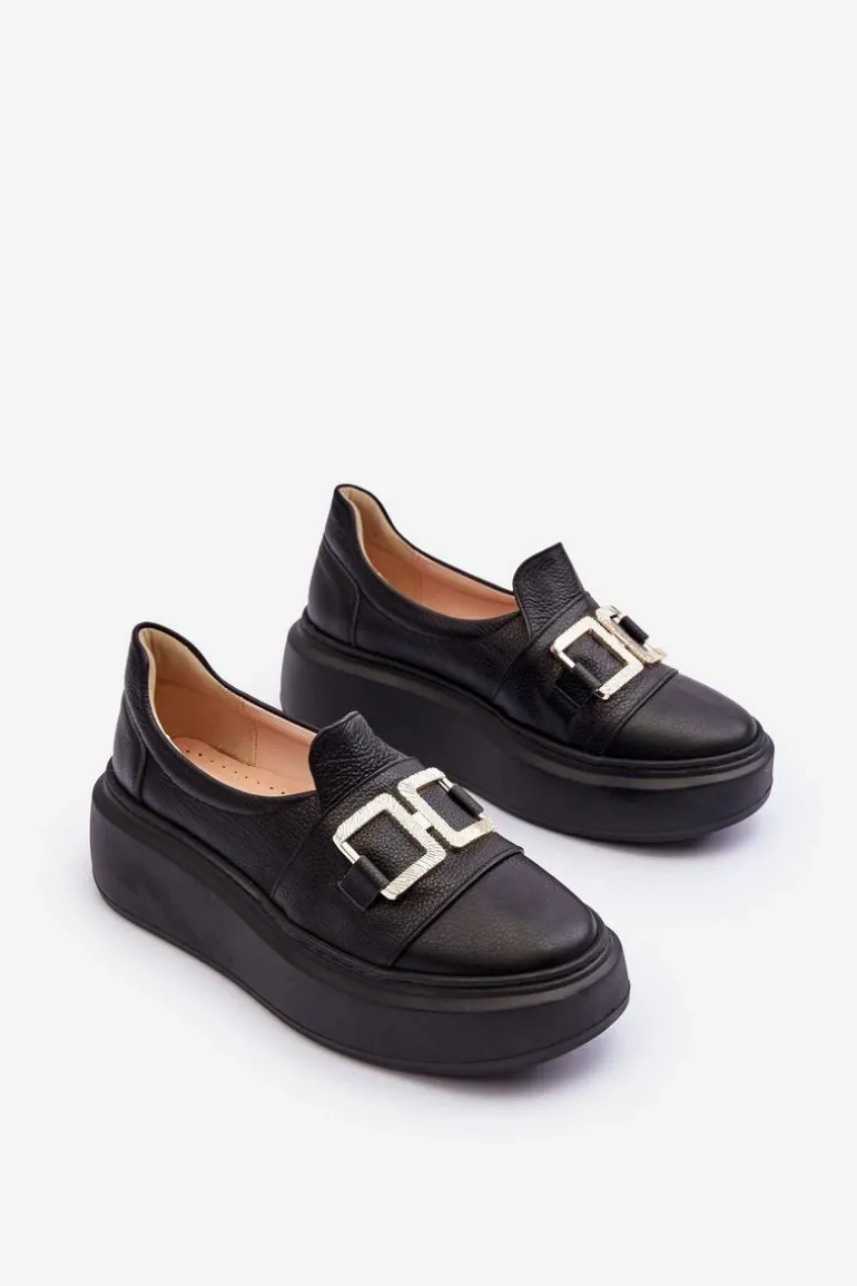 Damskie, wsuwane półbuty zostały wykonane z naturalnej skóry. Z przodu złota ozdoba z tworzywa sztucznego. Model ten osadzony jest na masywnej platformie. Pod językiem znajduje się elastyczna gumka, która pozwoli na odpowiednie dopasowanie obuwia do tęgości nogi. Noski zaokrąglone. Zapiętek usztywniony. Władka wykonana z naturalnej skóry zadba o komfort użytkowania przez cały dzień! Przy wyborze rozmiaru prosimy sugerować się tabelą rozmiarów.
