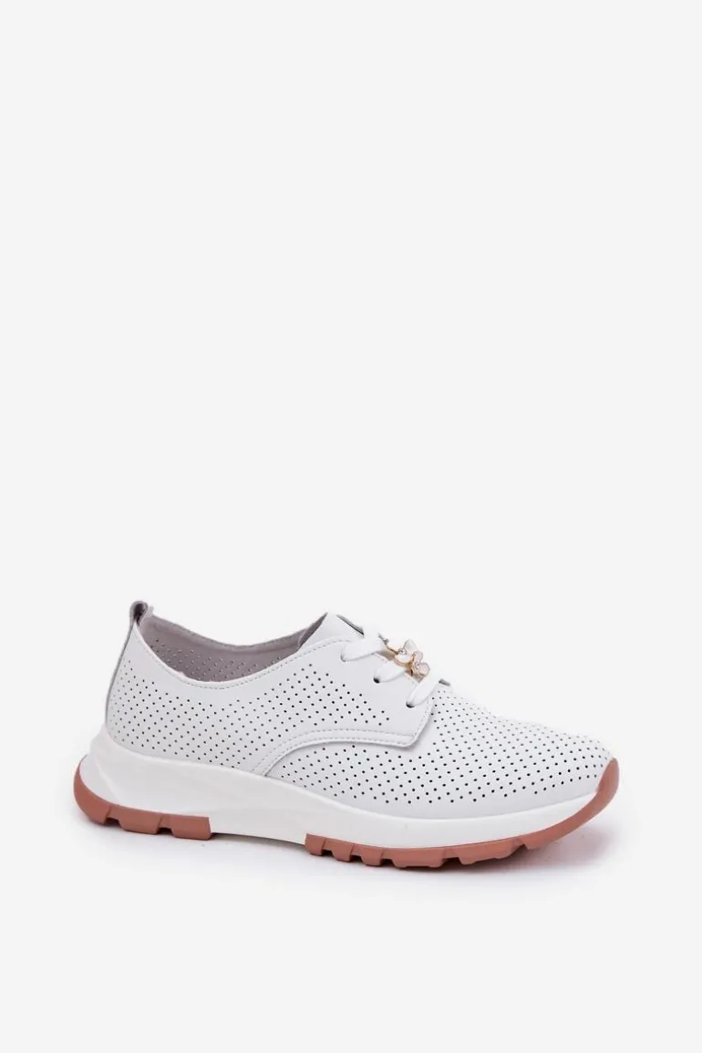 Półbuty damskie w sportowym stylu wykonane z naturalnej skóry to połączenie komfortu i modnego wyglądu. Osadzone na platformie, zapewniają lekkość i wygodę przez cały dzień. Sznurowanie ozdobione przypinką w kształcie kwiatuszków dodaje im urokliwego akcentu, a zaokrąglone noski gwarantują pełną swobodę ruchu. Skórzana wkładka dba o komfort stóp, czyniąc te półbuty doskonałym wyborem na co dzień. Przy wyborze rozmiaru prosimy sugerować się tabelą rozmiarów.