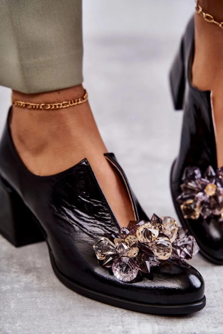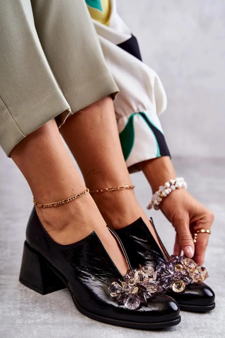 Eleganckie półbuty na niskim obcasie w postaci szerokiego słupka. Zostały wykonane z naturalnej skóry. Posiadają miękką wkładkę. Ozdoba przyszyta na przodzie oraz rozcięcie sprawia, że są naprawdę wyjątkowe. Buty posiadają nosek w kształcie migdała. Koniecznie sprawdź także pozostałe modele półbutów dostępnych w naszej ofercie! Przy wyborze rozmiaru prosimy sugerować się tabelą rozmiarów.