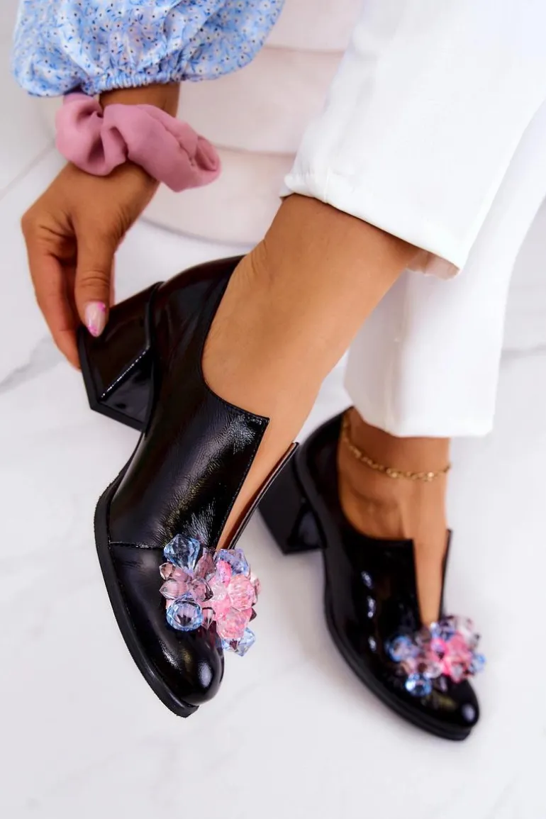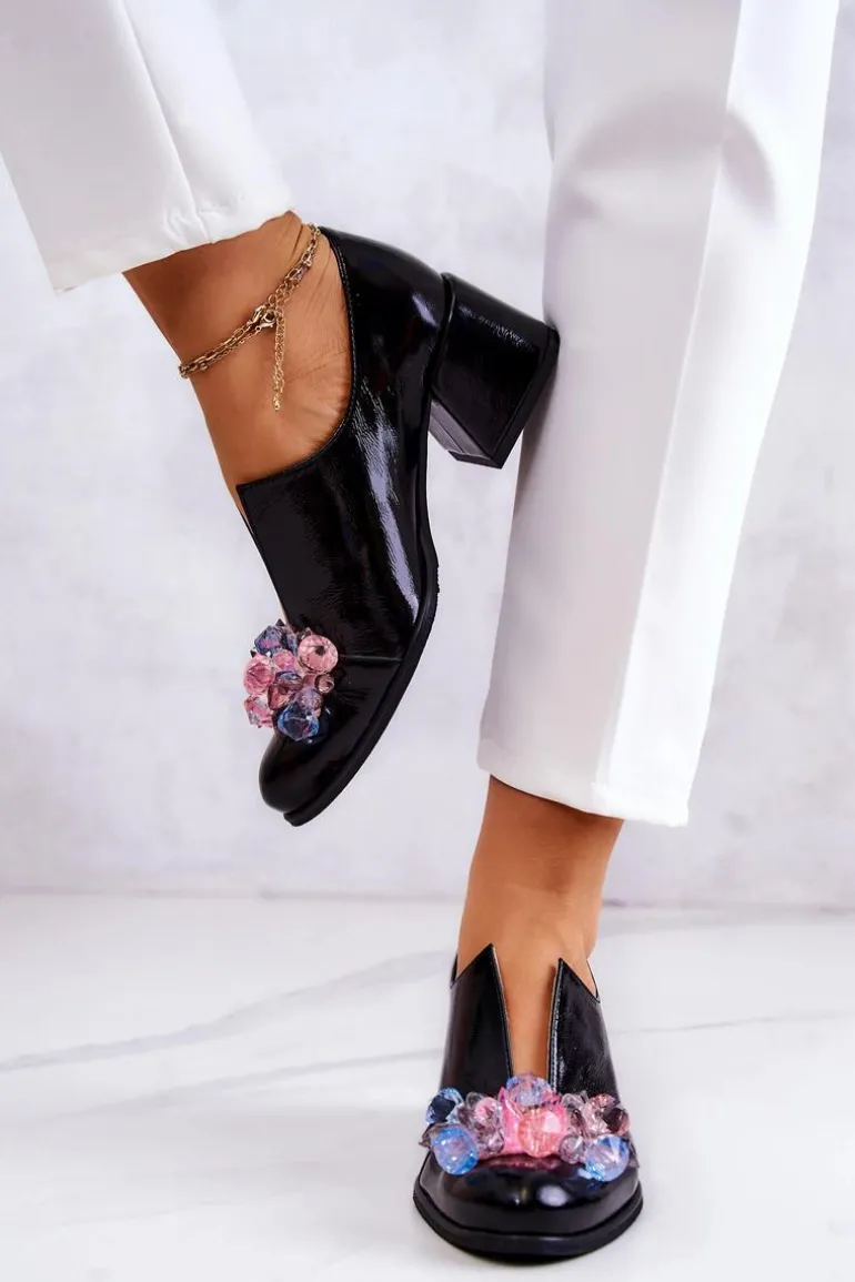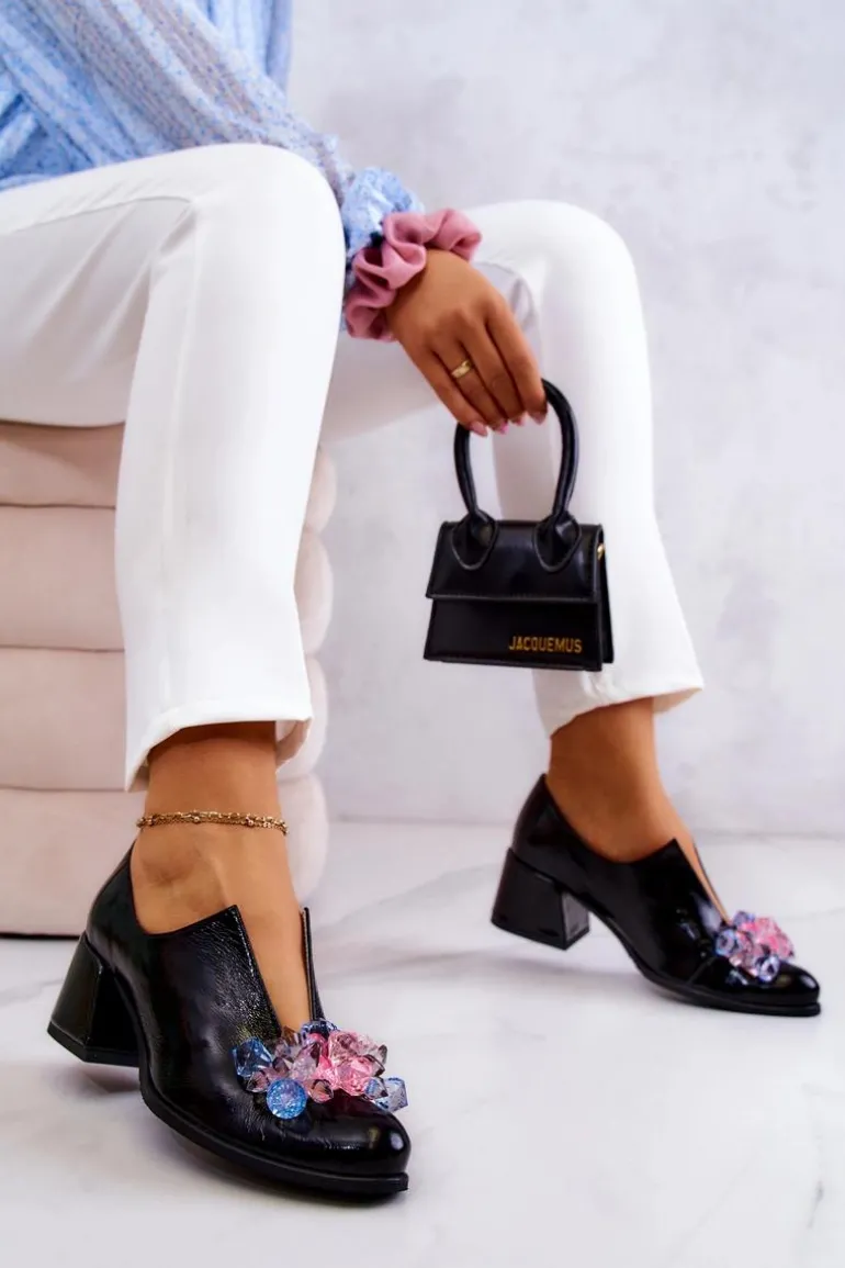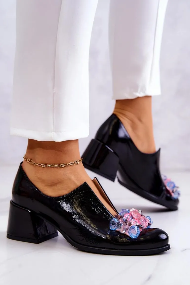 Eleganckie półbuty na niskim obcasie w postaci szerokiego słupka. Zostały wykonane z naturalnej skóry. Posiadają miękką wkładkę. Ozdoba przyszyta na przodzie oraz rozcięcie sprawia, że są naprawdę wyjątkowe. Buty posiadają nosek w kształcie migdała. Koniecznie sprawdź także pozostałe modele półbutów dostępnych w naszej ofercie! Przy wyborze rozmiaru prosimy sugerować się tabelą rozmiarów.