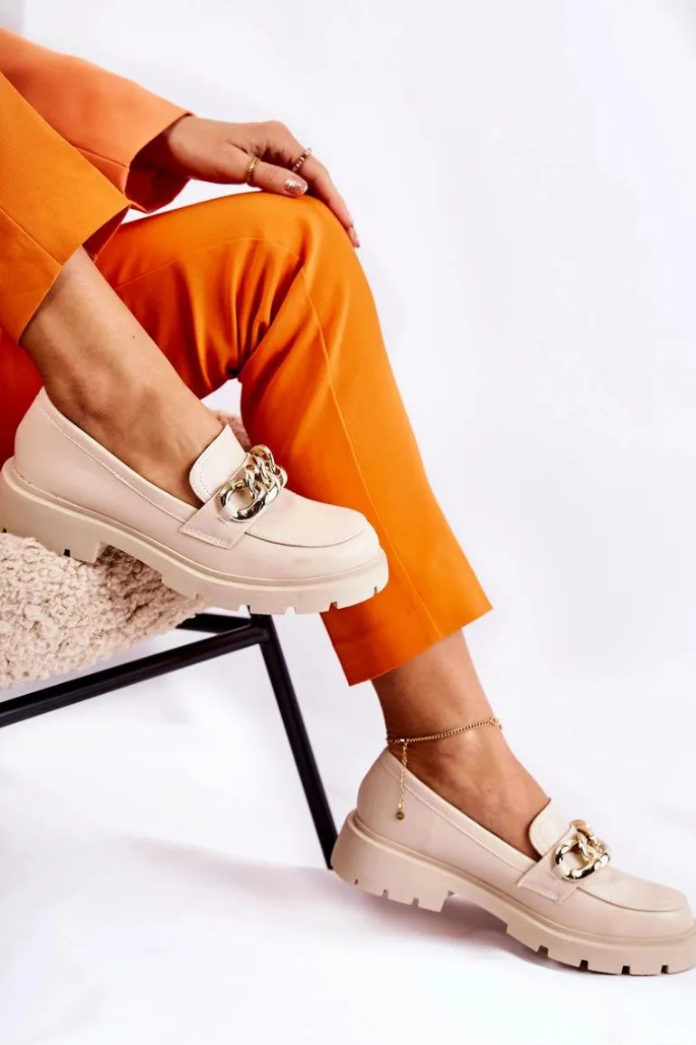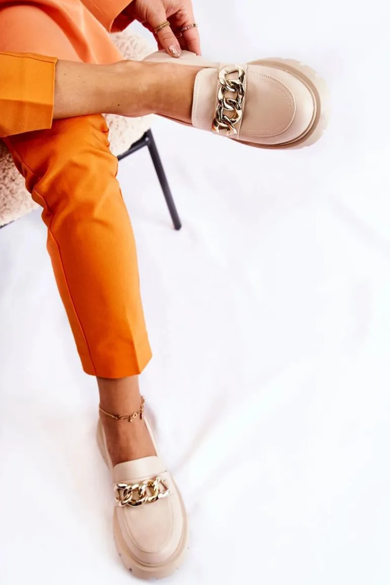 Świetne półbuty w stylu przepięknych loaferów. Buty zostały wykonane z wysokiej jakości eko skóry. Charakterystyczny łańcuch wygląda naprawdę cudnie. Półbuty posiadają grubszą podeszwę oraz obcas, który uniesie naszą sylwetkę. Miękka, eko skórzana wkładka zadba o wygodę podczas noszenia. Koniecznie powinnaś je mieć! Przy wyborze rozmiaru prosimy sugerować się tabelą rozmiarów.