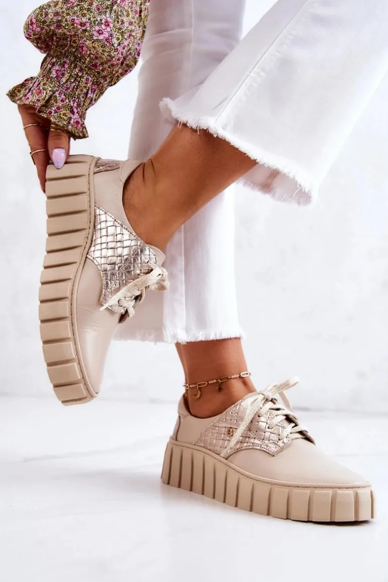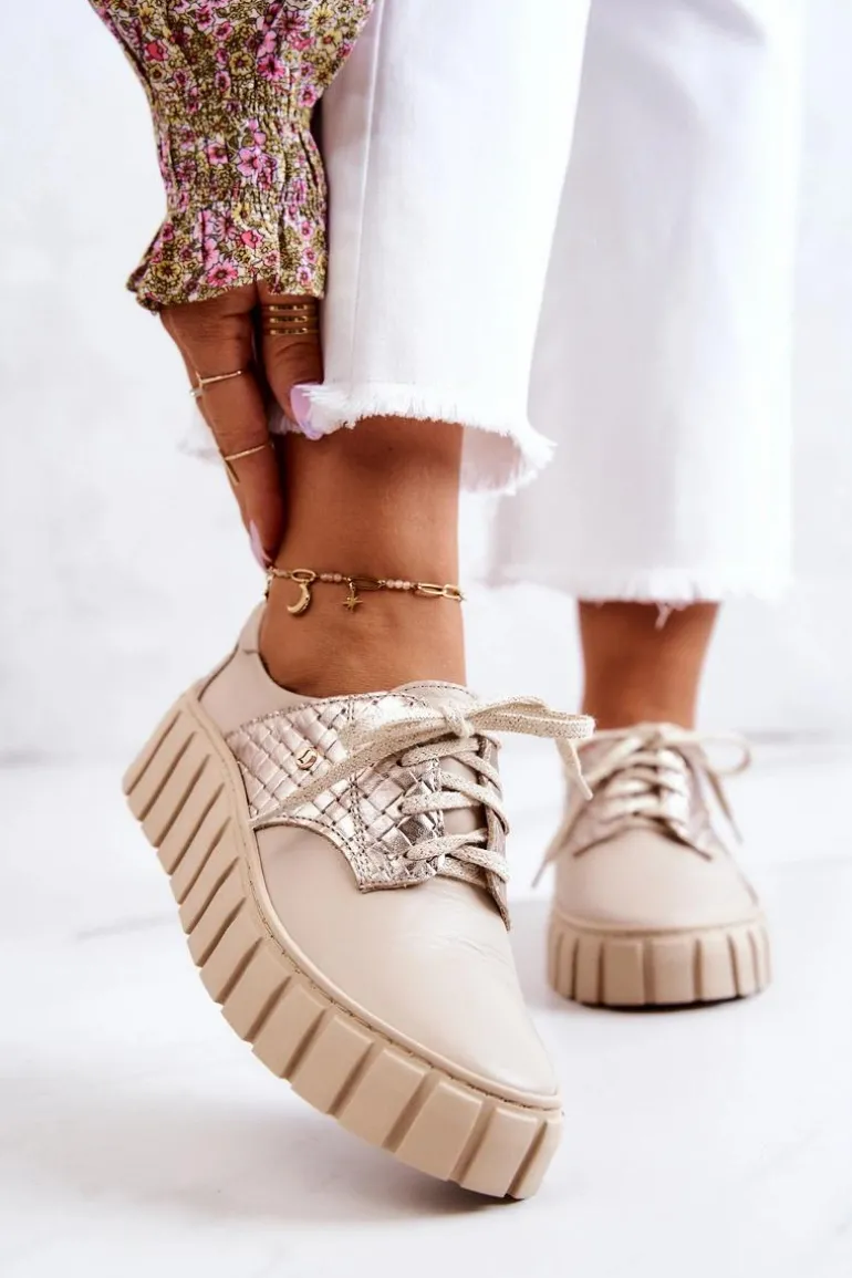 Półbuty posiadają wiązanie na płaskie, ozdobione błyszczącą nicią sznurowadła. Osadzone na masywnej platformie ze żłobieniami po bokach. Wewnątrz wygodna wkładka z naturalnej skóry, która jest dodatkowo profilowana. Cholewka przed kostkę została wykonana z naturalnej skóry z efektem metalicznym. Bardzo lekkie i komfortowe w użytkowaniu. Idealne do eleganckich spodni, tiulowych spódnic czy dzianinowych sukienek. Możesz je łączyć z różnymi stylizacjami – zawsze będą wyglądać świetnie! Te cudne buty zdecydowanie muszą znaleźć się w Twojej garderobie!Przy wyborze rozmiaru prosimy sugerować się tabelą rozmiarów.